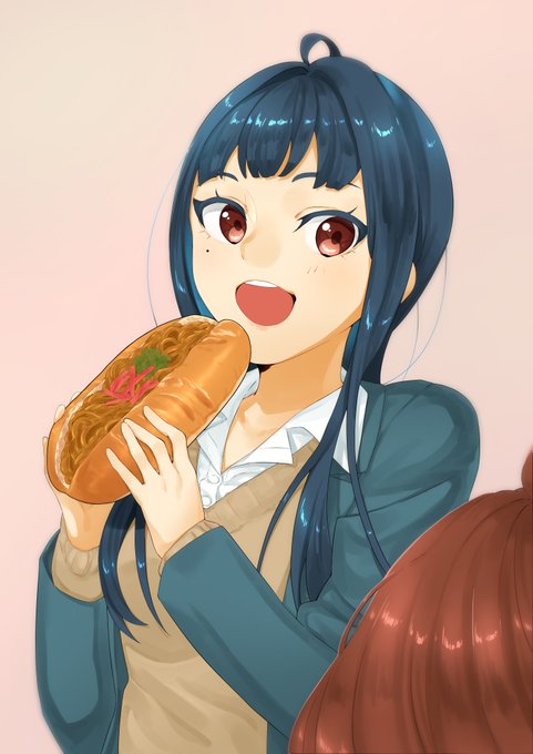 らでぃっ しゅーさん(@syuuu_0000 )の #たべおし合同 に参加させていただきました! 最初ムスビに何食べさせようか迷っていたんですが、結局やきそばパンに戻ってきました。 放課後、レッスンが始まる前の腹ごしらえにハルと一緒に談笑しながら食べているのかなと思って描きました! #ナナピク