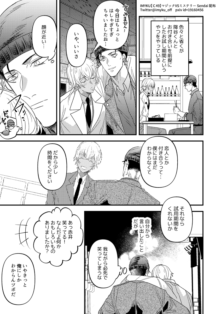 仙コミ/マジミスsendaiの無配漫画(赤安) 色恋について経験は初恋で止まっているけれどシュを惑わすことを無自覚にやれてしまうれーくんとそれに翻弄されながらもそれすら新鮮で楽しくれーくんを待つシュが好きです
