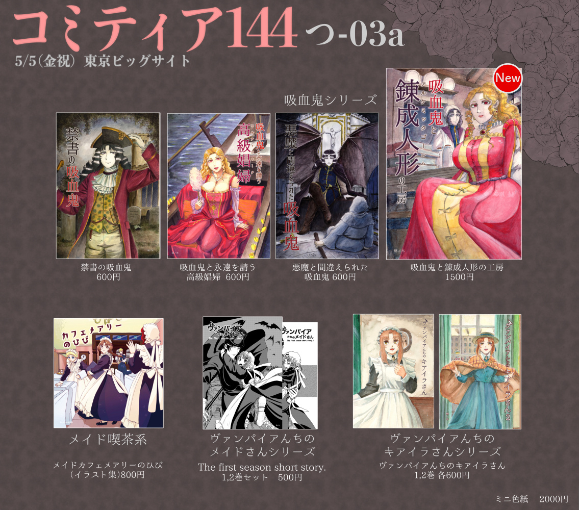 #COMITIA144 #コミティア144 既刊「ヴァンパイアんちのメイドさん眷属編再録集」 A5/260P 1700円 「ヴァンパイアんちのメイドさんお屋敷編再録集」 A5/220P 2000円 少しだけヴァンメイシリーズの再録本も持参します!The first season short story1,2巻の続きとして読めます pixiv.net/artworks/61027…