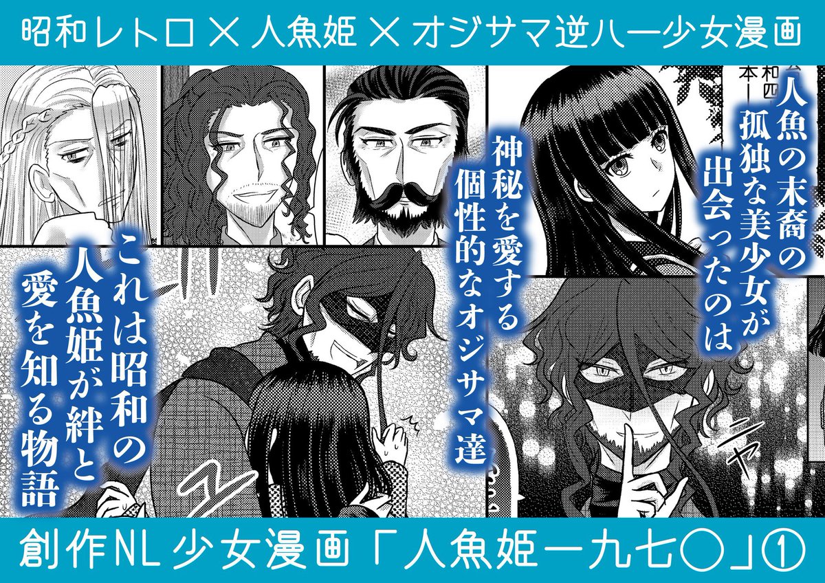 昭和の日ということで、うちの創作漫画を改めてご紹介! 昭和40年代を舞台に、人魚の末裔の少女がオカルト好きなオジサマ達に愛される少女漫画を描いております✨ 漫画本編のURLはツリーにて #GWはフォロワーさんが増えるらしい #春の創作クラスタフォロー祭り #自創作に狂っている人間と繋がりたい
