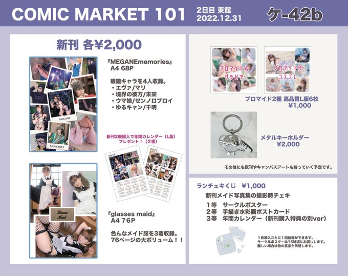 コミケのお品書きが出来ました! 新刊は眼鏡キャラ写真集とメイド写真集💙 2日目東ケ-42bでお待ちしてます👓 #C101