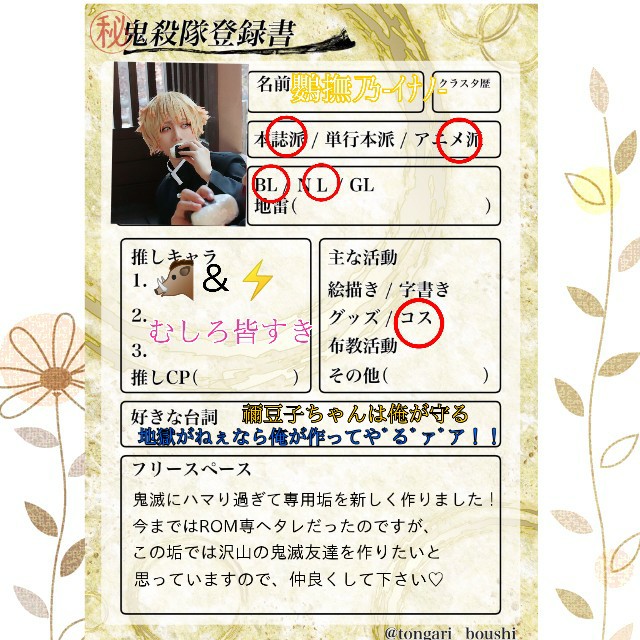 気が合いそうな方は、お迎えにあがらせて頂きます♡ どうぞ宜しくお願い致します♪ テンプレお借りました! ※20↑です ※日常ツイ、コス写真注意 #鬼滅の刃レイヤーさんと繋がりたい #鬼滅レイヤーさんと繋がりたい #コスプレ #鬼滅の刃クラスタさんと繋がりたい #鬼滅の刃自己紹介テンプレ