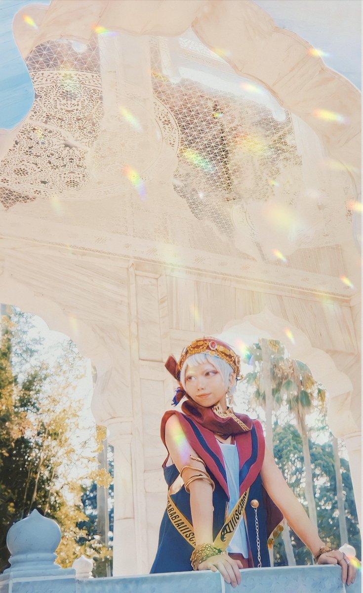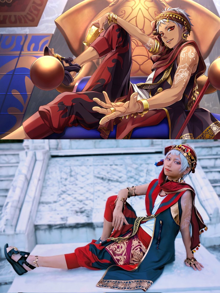 【twst コスプレ注意】 新年でトップ画変えたついでに!❤ 隣じゃなくて下になっちゃったけど😆✨ #原作の隣に自分のコスを貼る このまま次元の壁超えて、カリムくん落ちてきてくれないかな……🤤 むしろ台座になるので踏んでください…笑 (同じじゃないけど1番近いポーズの写真選んだ🥰)