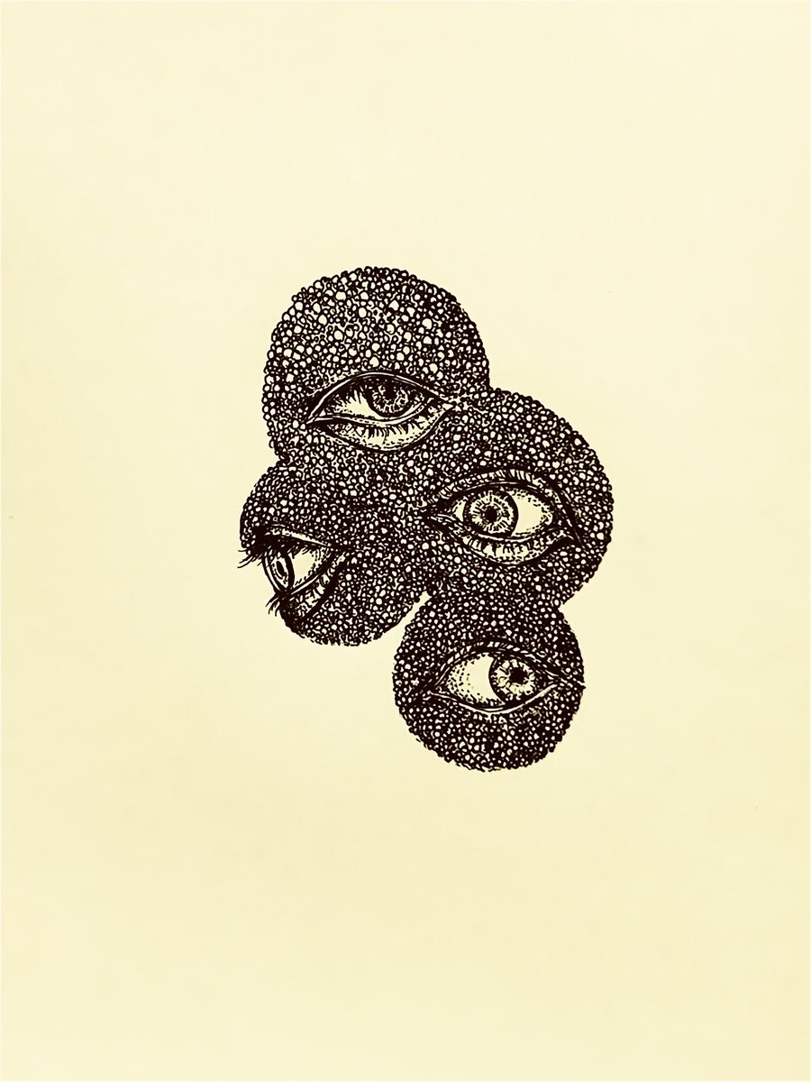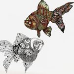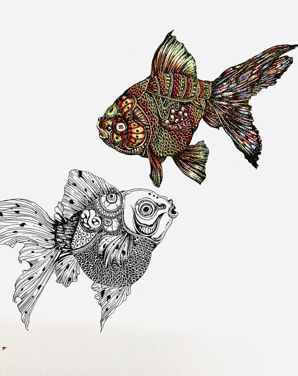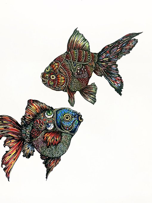 #ペン画 #金魚 #目玉 金魚着色前 目玉のやつも未完成 基本的に絵は仕事の休憩時間に描く。