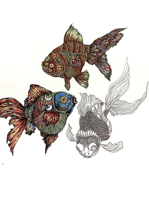 0 12 #ペン画 #金魚 #目玉 金魚着色前 目玉のやつも未完成 基本的に絵は仕事の休憩時間に描く。 22/04/06 13:50