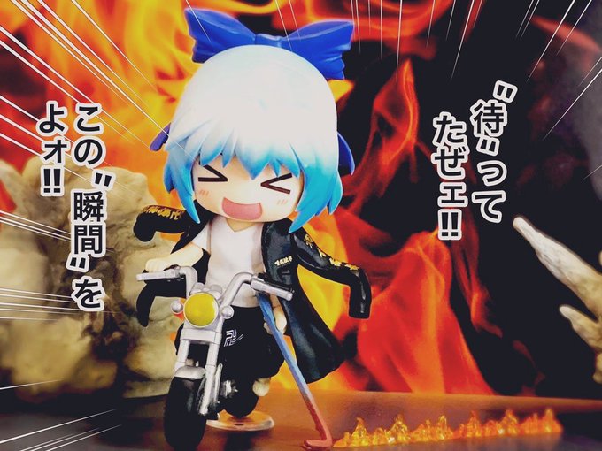 #深夜のねんどろ撮影60分一本勝負 お題【おきにいり】(既出) 何か待ってた時に使える『お気に入り』ネタ写真です(*´ω`*) ガシャポンのデロリアンから炎エフェクト、ニャル子のバール、マイキーのバイクと特服を使用してます♪