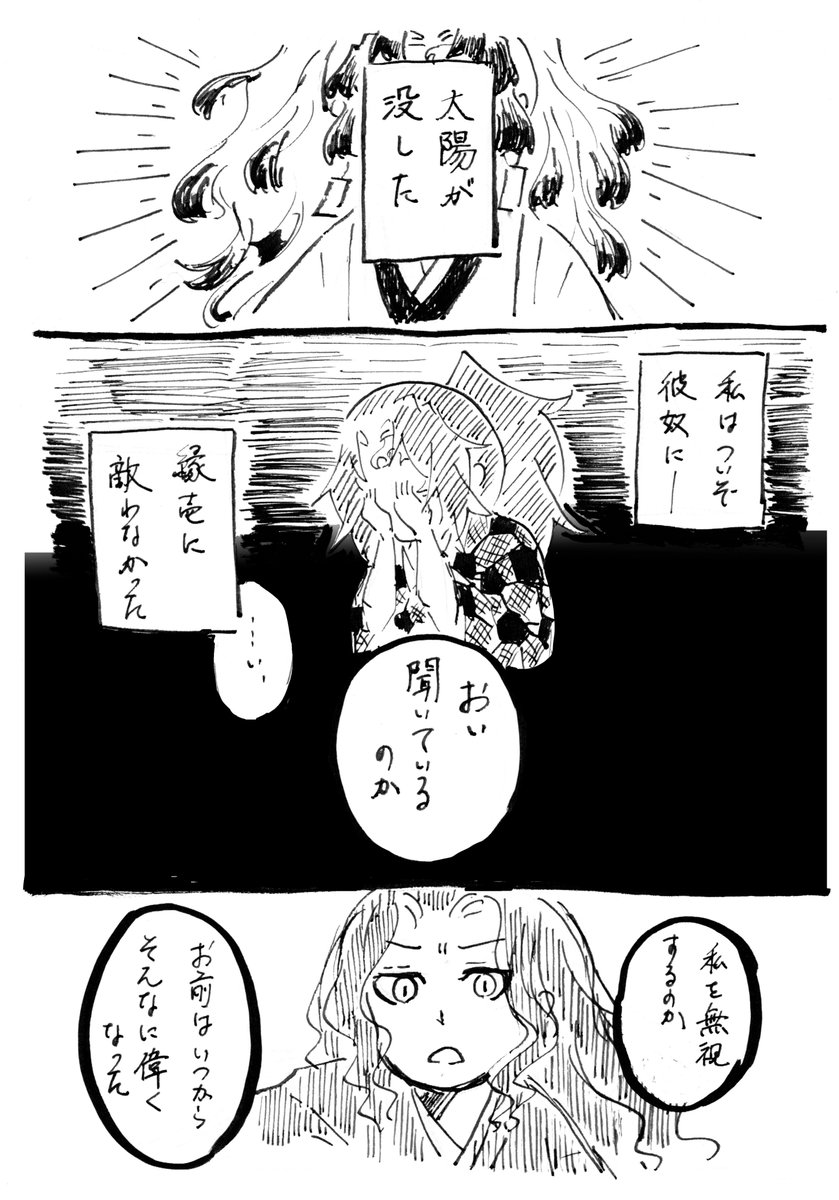 9 79 #鬼さん深夜の60分一本勝負 @oni1draw1write お題【太陽】【月】 コクシボーとムザンサマ 太陽のない今、月はもはや鬼狩に味方しないのだ 20/11/13 23:15