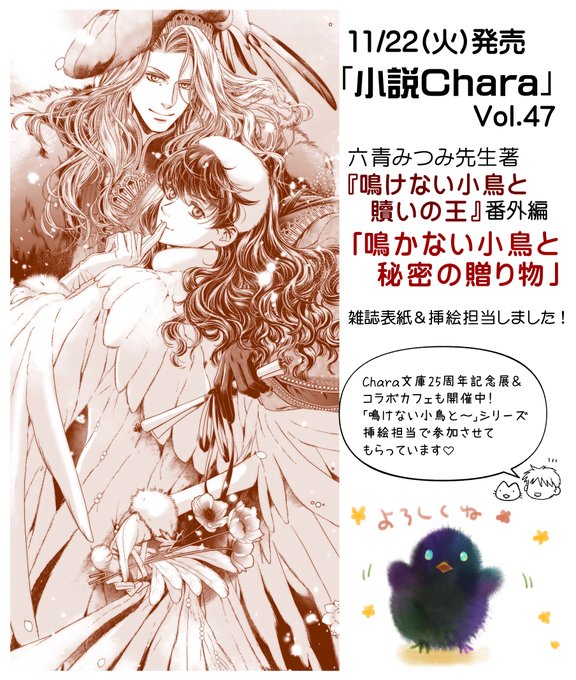 11/22発売の『小説Chara vol.47』で表紙イラストと六青みつみ先生『鳴けない小鳥と償いの王』番外編の挿し絵を担当させていただきました。コミコミさんでは購入特典でイラストカードが貰えますよ 🐣<25周年おめでとうございます✨ twitter.com/chara_tokuma/s…