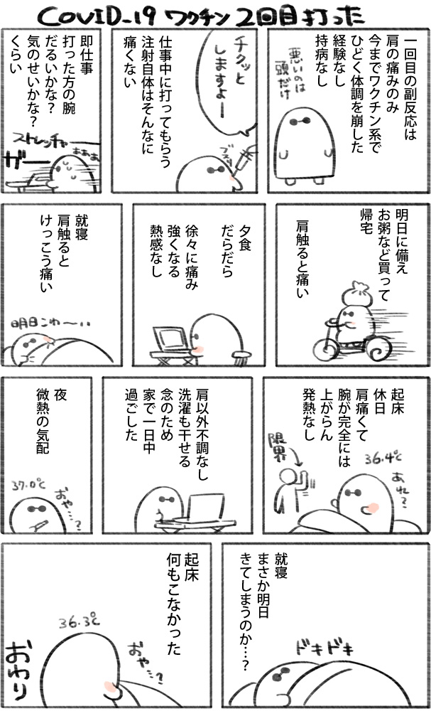 ワクチン二回目レポ ひどくなった例の紹介が多いけど、人によってはこれくらい軽い例もあるよということで。