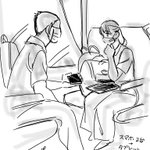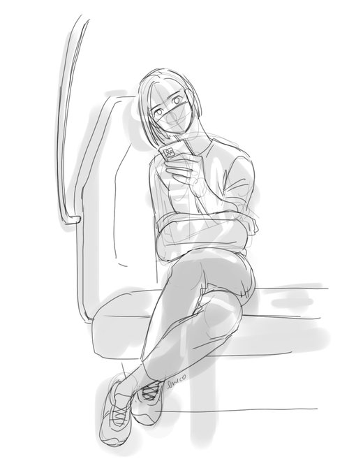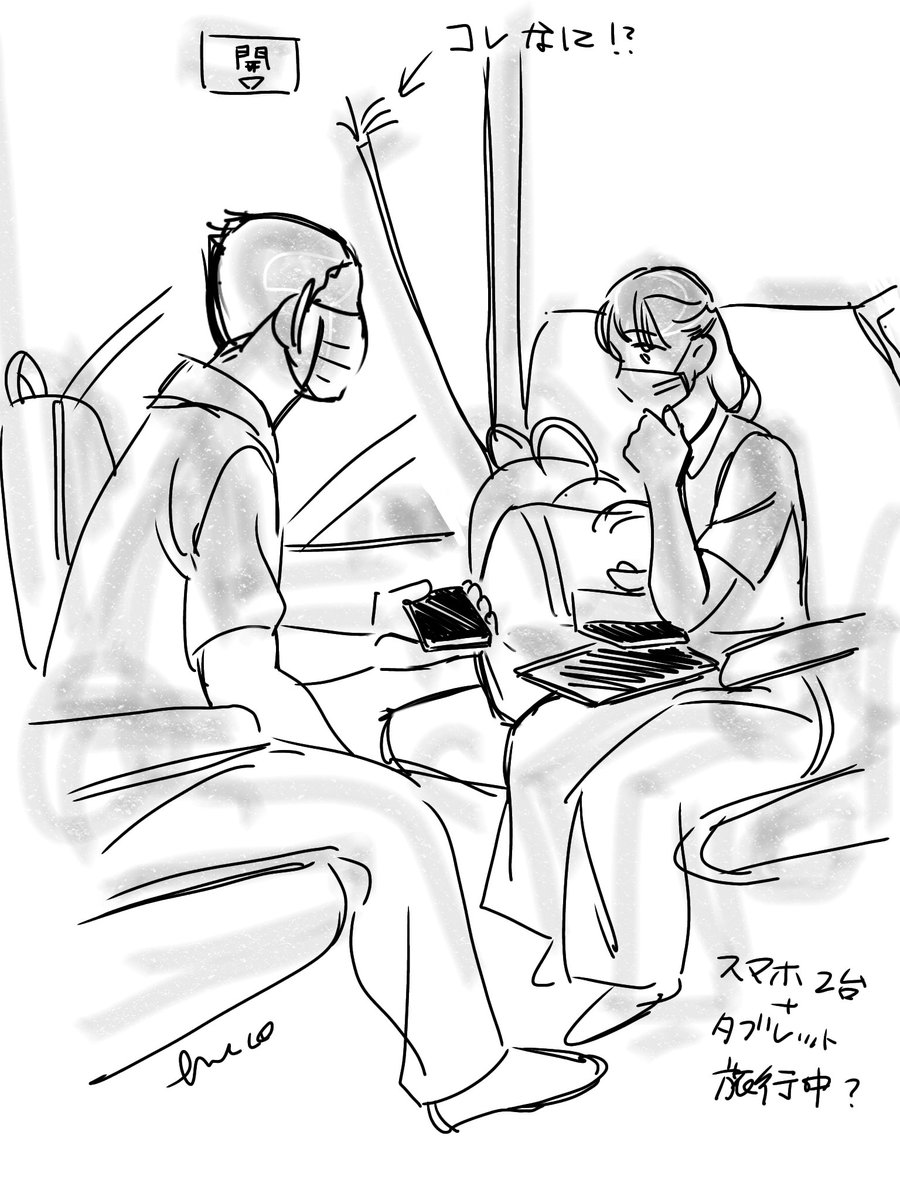 #ふくろうセミナー #カフェスケッチ #アイビスペイント 電車内で荷物を足で挟みながらスマホ見せて話をする人たち