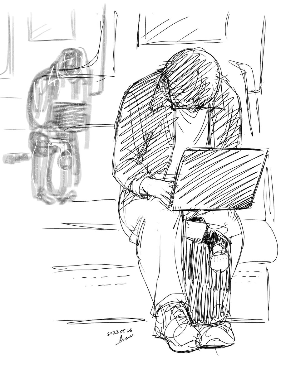 2 12 #ふくろうセミナー #カフェスケッチ #アイビスペイント 電車待ち。どうしたの?あんよ疲れてたの? 22/05/30 07:27