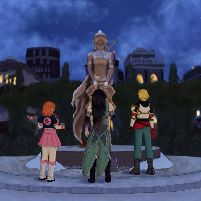 "Nora and Ren look up and notice the statue of their old friend. Team JNPR stands together once more, only with Pyrrha immortalized by her statue." #jnpr #teamjnpr #rwby #fanart #rwbyfanart #jaunearc #noravalkyrie #pyrrhanikos #lieren