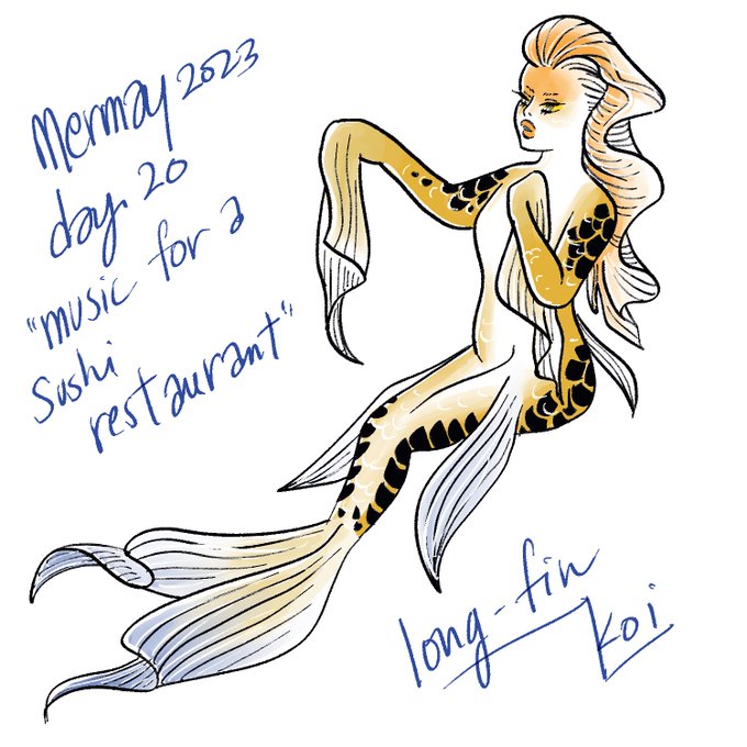 Day 21 is “music for a sushi restaurant” and all I could think of was the glam of enka songs… anyway here’s a long fin koi. #mermay2023 #drawmermay2023