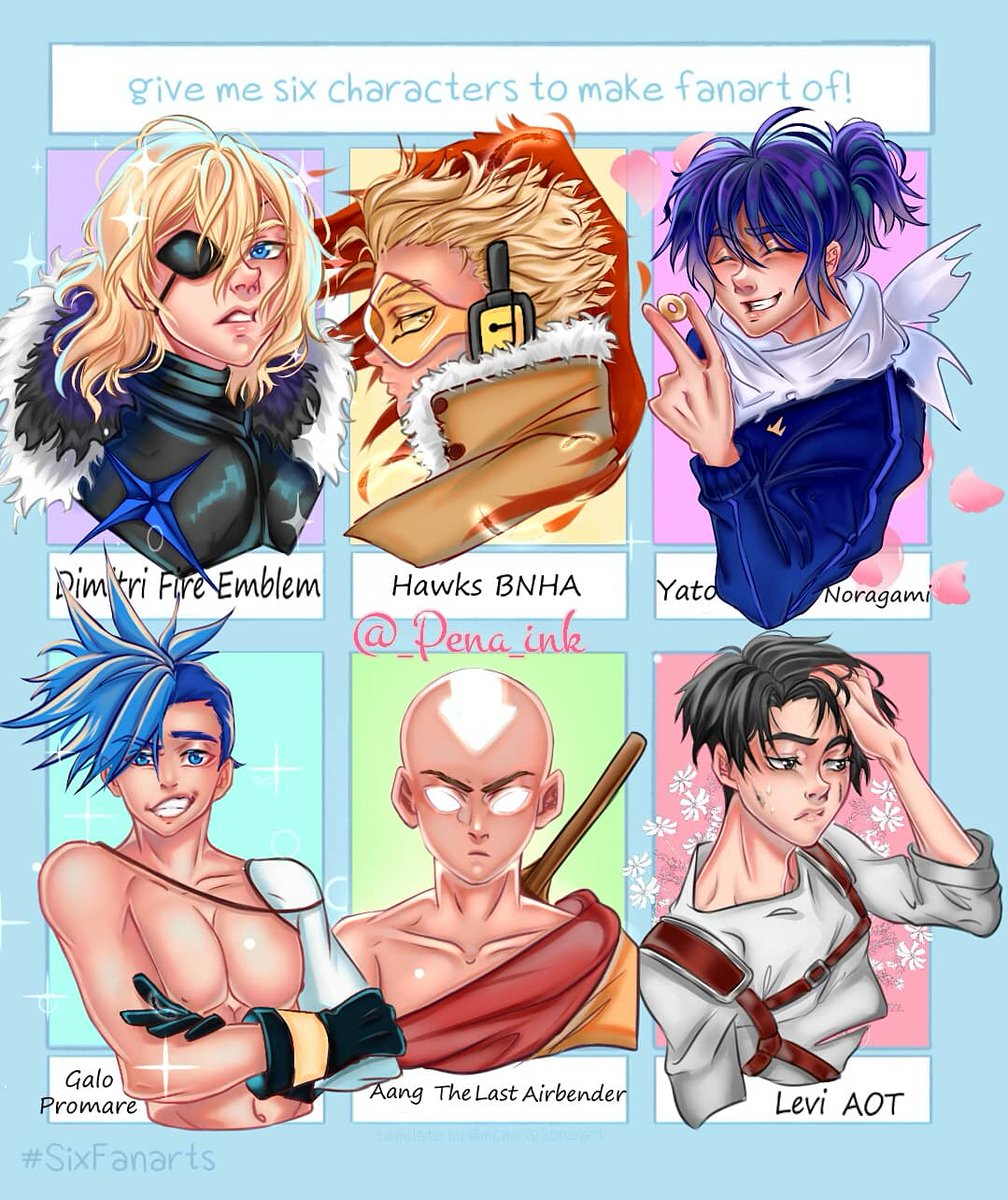 ✨ #sixfanarts Challenge completed✨ I had a blast drawing these in Livestreams talking to you guys😍😍😍 If you missed my streams check my IG account 💕instagram.com/_pena_ink/💕 #SixFanartsChallenge #fanart #dimitri #hawks #yato #galo #Aang #levi #aot #BNHA