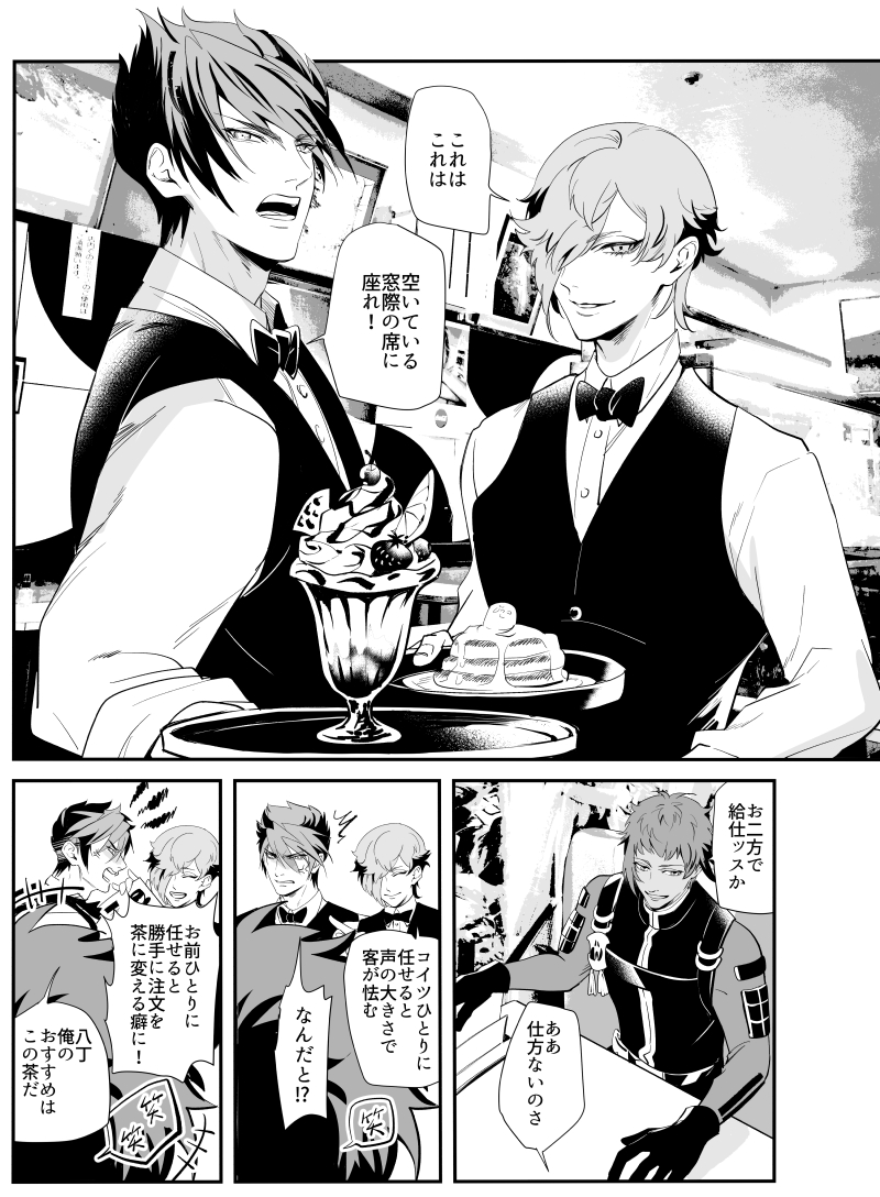 109 434 5/3スパコミ閃華新刊「純喫茶つくもパーラー」サンプル1/2 喫茶店本丸での給仕刀&客刀のオールキャラオムニバス漫画 東1キ57a『4線独戦』にて頒布予定 32頁500円 23/04/30 19:41