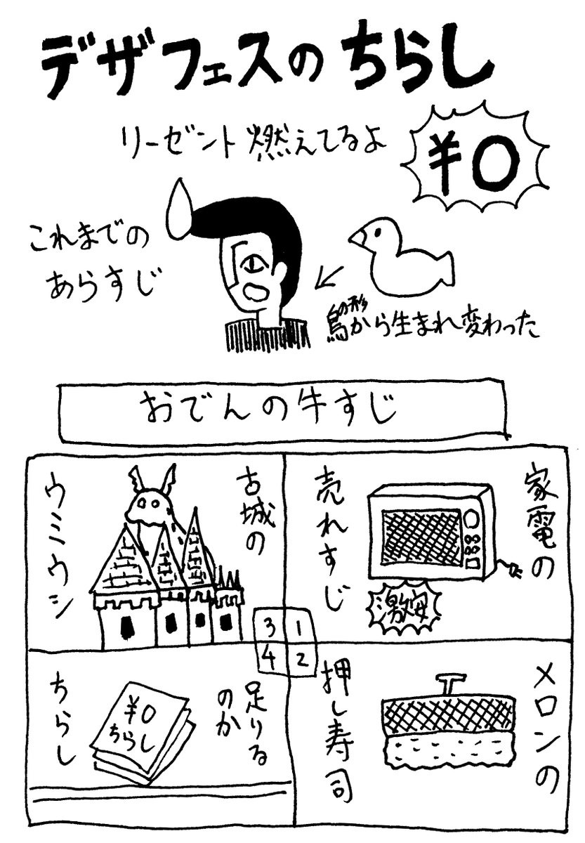 デザフェスでは毎回フリーペーパーを配布ています。近々のお知らせ等の他、4コマ漫画も載せています。11/19(土)の #デザフェス56 でも配布します。ちなみにこんな4コマです。 #リーゼント燃えてるよ #デザインフェスタ #デザインフェスタ56 #漫画が読めるハッシュタグ