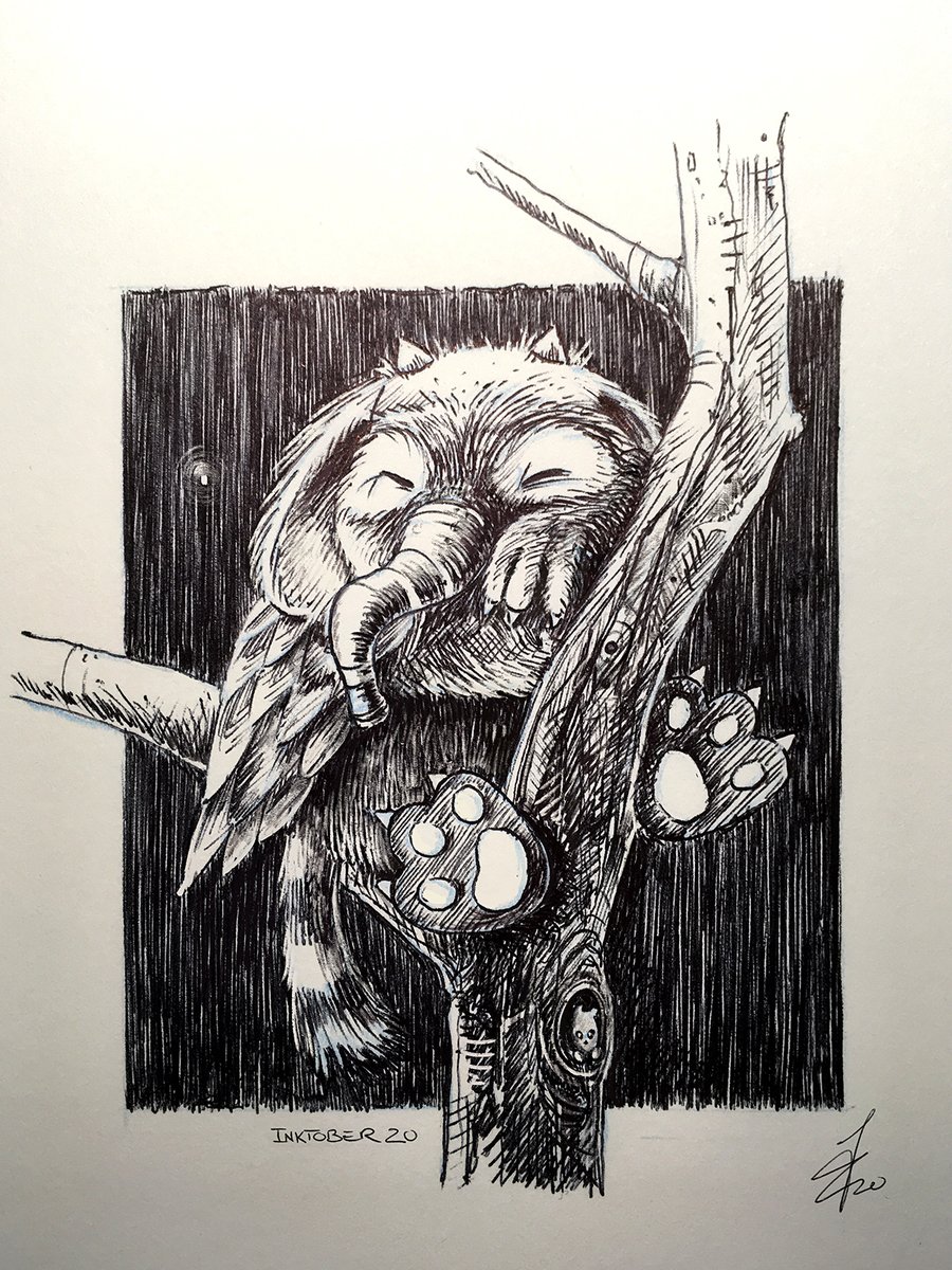 Gonna grab myself a tree and do the same thing🤫 Sleep tight out there! *Piece inspired by #creature design guru @bobbychiu ‘s work #inktober2020 #inktober #sleep #inktoberday21