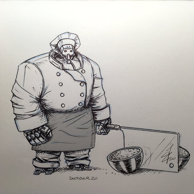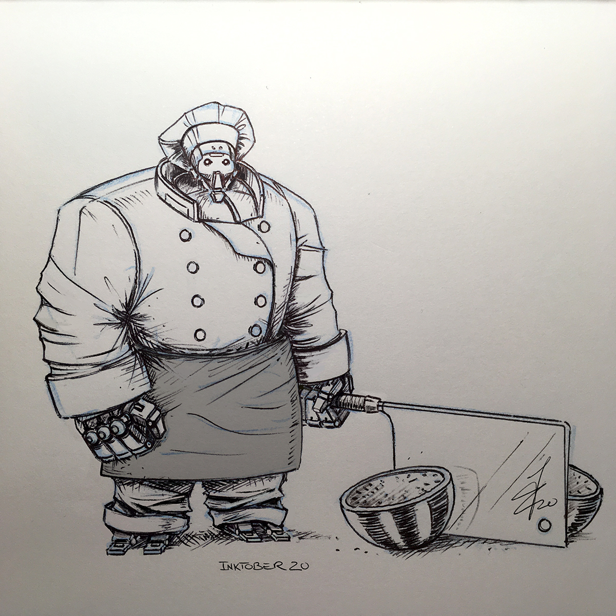 Catching up! This droid used to be part of Earth defense army 2.0, look at him now, reprogrammed with a new protocol! #inktober2020 #inktober #chef #inktoberday22