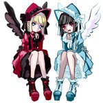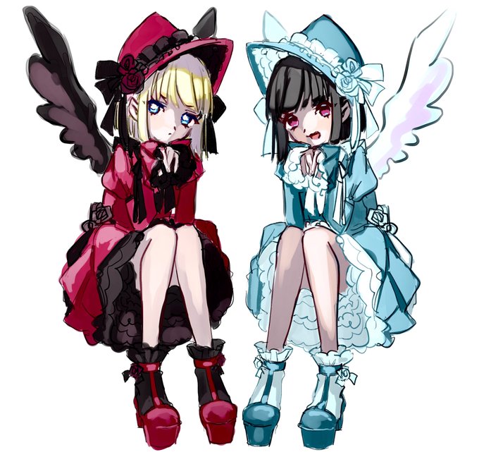 ロリ(たぶん)に羽をはやしたかったシリーズ ゴスロリちゃんとロリータちゃん 赤黒金髪碧眼って真紅すぎるよね #イラスト #創作イラスト