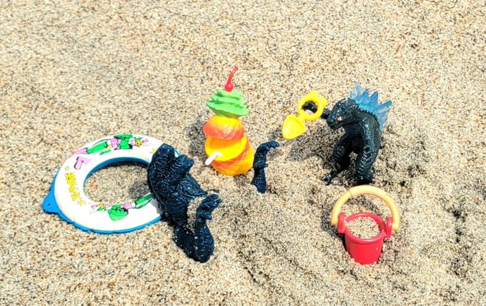 ゴジママ こんにちは!うちの子も一緒に遊んでもらっていいかしら☺️ 🐱 いいよ🎶 🦒 一緒におやまつくろう😊 #シル活 #ゴジラ #オモ写