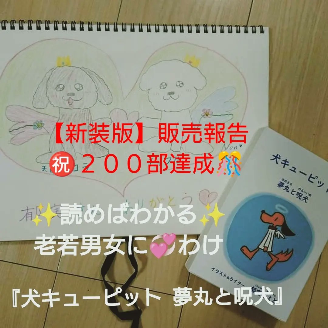 『犬キューピット夢丸と呪犬』 ㊗️お陰様で200部達成‼️ 出版不況の時世、組織の後立なく、SNSだけの細々販促でこの本を手に取り、お金を使って貰え、この上なく嬉しく励みになります🥰 #犬好きさんと繋がりたい #猫好きさんと繋がりたい #読書好きな人と繋がりたい #保護猫 #保護犬 #イラスト