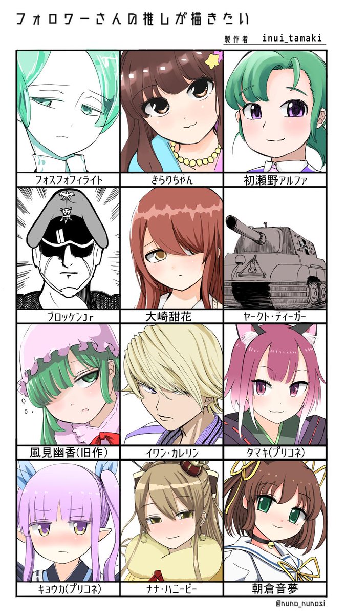 みなさんありがとうございました #フォロワーさんの推しが描きたい ・フォスフォフィライト ・きらりちゃん ・初瀬野アルファ ・ブロッケンJr ・大崎甜花 ・ヤークト・ティーガー ・風見幽香(旧作) ・イワン・カレリン ・タマキ(プリコネ) ・キョウカ(プリコネ) ・ナナ・ハニービー ・朝倉音夢