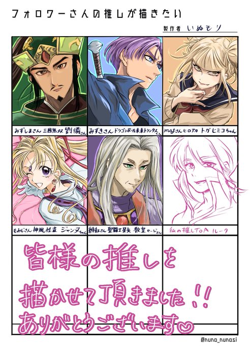 #フォロワーさんの推しが描きたい @dam323 みずしまさん 劉備玄徳さん @yukimizuki27 みずきさん 未来トランクスくん @magnolia_love00 magさん トガヒミコちゃん @JB8MOh0c46gMuAM もみじさん ジャンヌちゃん @Hiou_Akane 緋紅さん 教皇セージさん