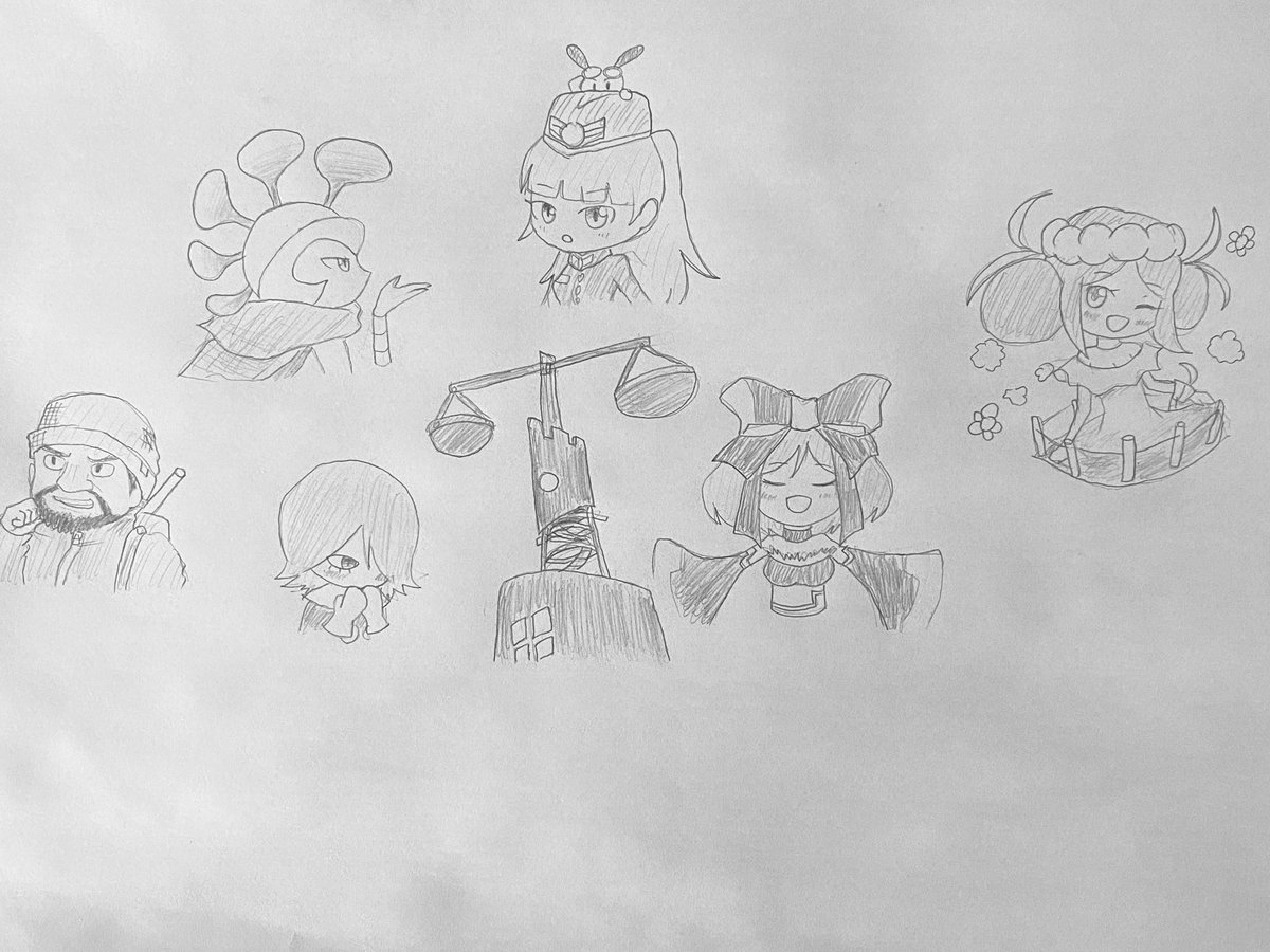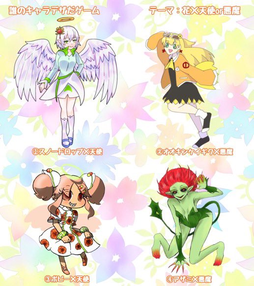 #誰のキャラデザだゲーム あずさサマ(@maxx1azusa )主催の誰デザ今回も参加させていただきました… ワタシは⑥のアザミ悪魔を描きました リプライにアンケ貼りますので、ワタシがデザインした子を予想してみてくださいませ…