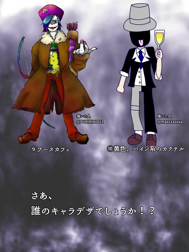 #誰のキャラデザだゲーム 誰デザ初参加です!(※あずささん@maxx1azusa 主催) 今回のテーマは「カクテル+闇落ち」です。ワテクシNANAMIは⑥のコペンハーゲンを描かせていただきました リプにアンケ貼るのでワテクシがデザインした子を当ててみてくださいませ…