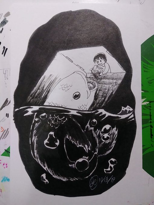 Kid feeding an koi fish he hid in the flooded basement #Inktober2019 #Inktoberday14 #inktoberovergrown #koi #fish