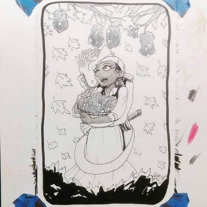 Day 31 Ripe: Eli & Rokka enjoying the ripe harvest of autumn. & I'm done man. I'm gonna decompress now hahaha hahaha i kinda made it #Inktober2019 #inktoberday31 #inktoberripe #lizardman #monsterlove