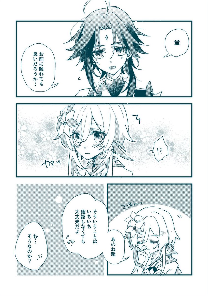 326 2228 付き合い始めたばかりで魈とキスしたいけど恥ずかしい蛍ちゃんと、嫉妬を覚えた魈の雰囲気rkgkな魈蛍 22/10/18 01:49
