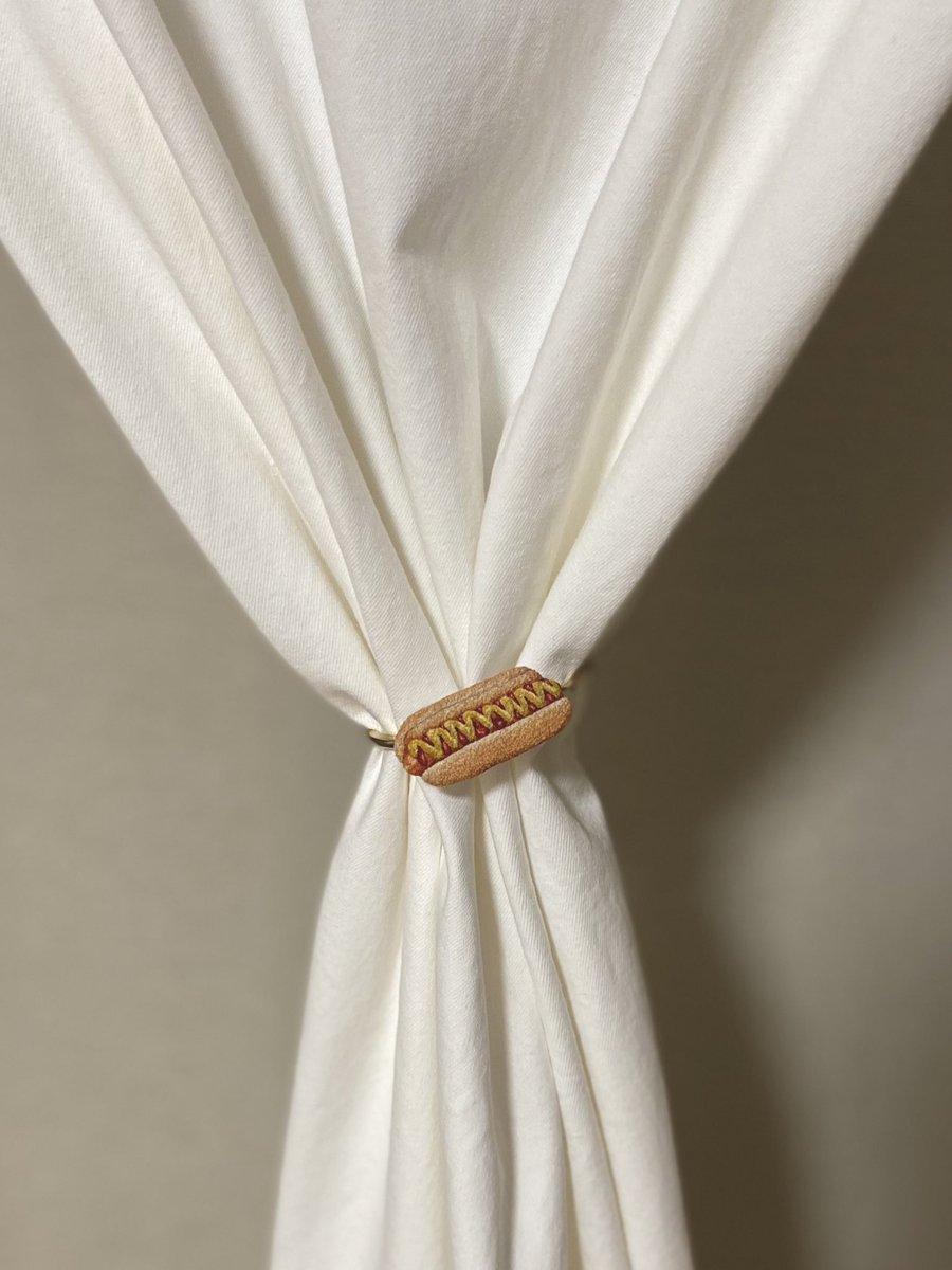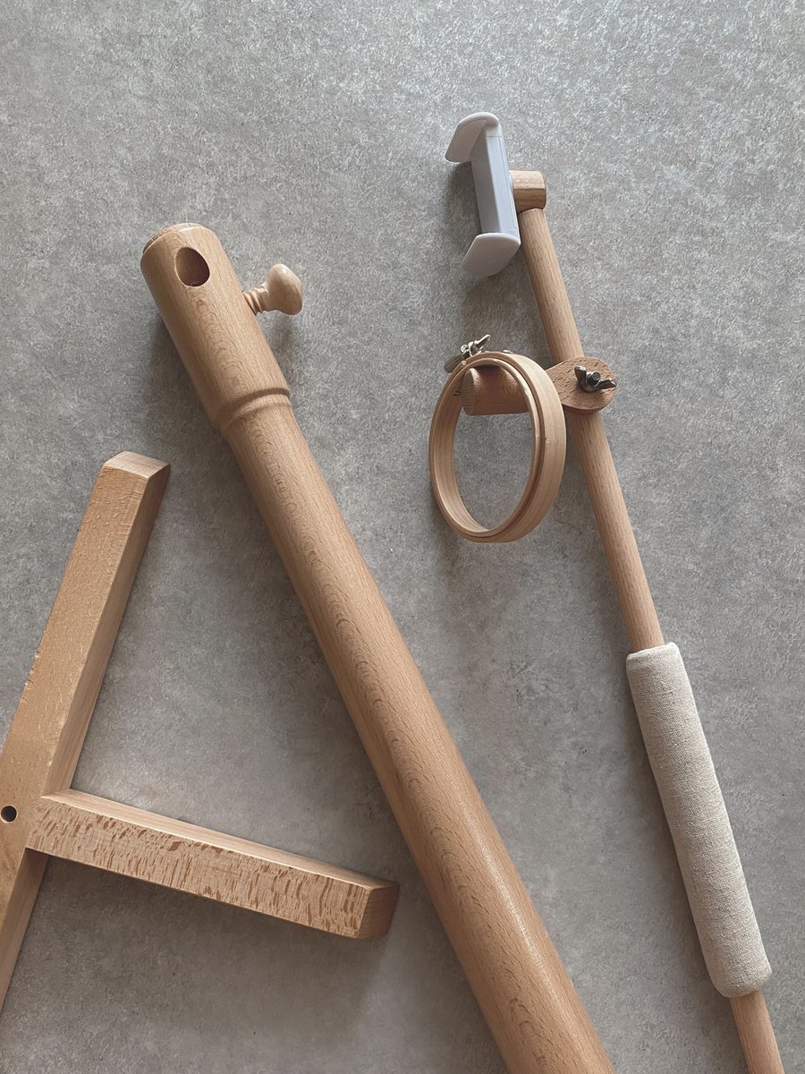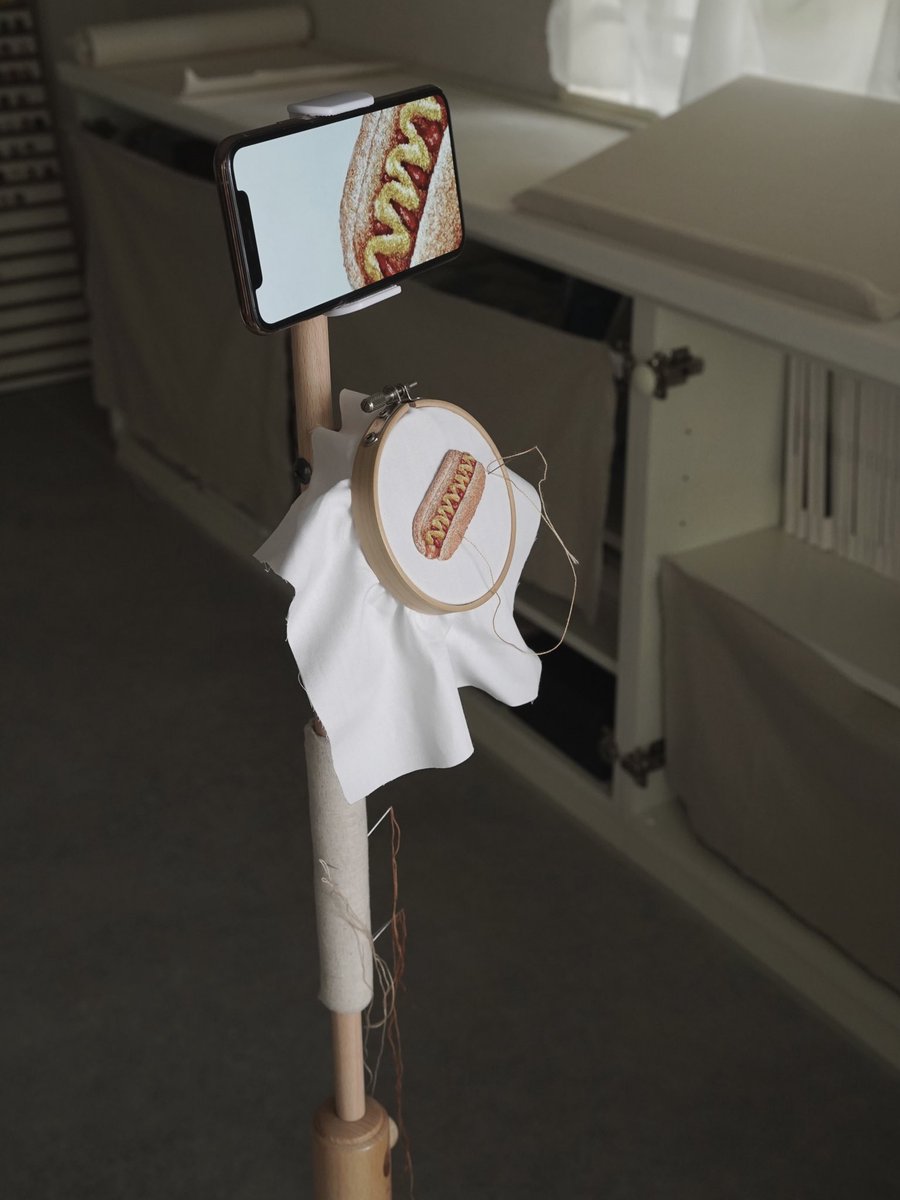猫背にならない刺繍スタンドできました🪡高さ約1メートル+目線の高さ調節可能、刺繍枠大小サイズ付け替え可能、ついでにスマホ/写真ホルダーと針山も追加して快適。こんなの欲しかった!ますます刺繍が楽しいです。(ホットドッグは過去作🌭