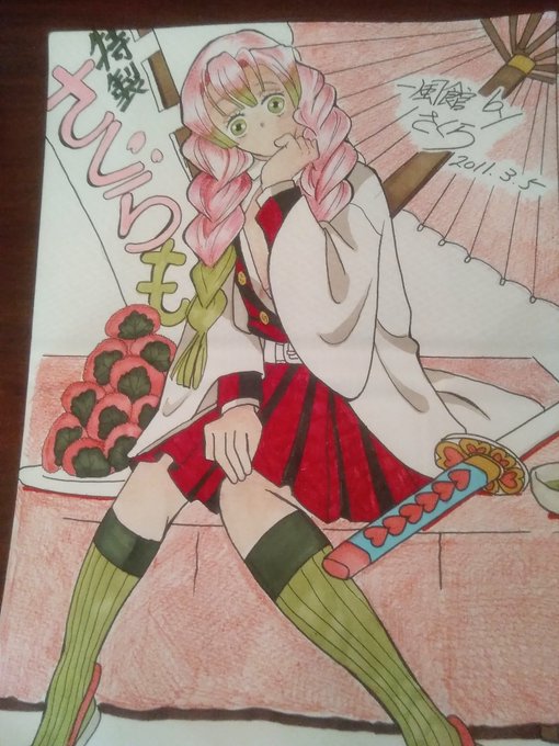 日付は5日になってますが、蜜璃ちゃんを描いてみました❤ 山積みの桜餅を前に、どうしようかなぁ〜と思案中。蜜璃ちゃんのチョイスは、道明寺です❤ #鬼滅の刃 #鬼滅の刃イラスト #甘露寺蜜璃 #絵描きさんと繋がりたい #色鉛筆イラスト #アルコールマーカー #鬼滅の刃絵描きさんと繋がりたい
