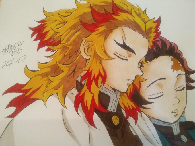 (o`∀´o)ノチワ———ッス!! 久しぶりに、模写をしてみました。 無限列車編より、肩を寄せて眠る煉獄さんと炭治郎です❤ #鬼滅の刃 #鬼滅の刃イラスト #無限列車編 #鬼滅の刃絵描きさんと繋がりたい #竈門炭治郎 #煉獄杏寿郎 #アルコールマーカー