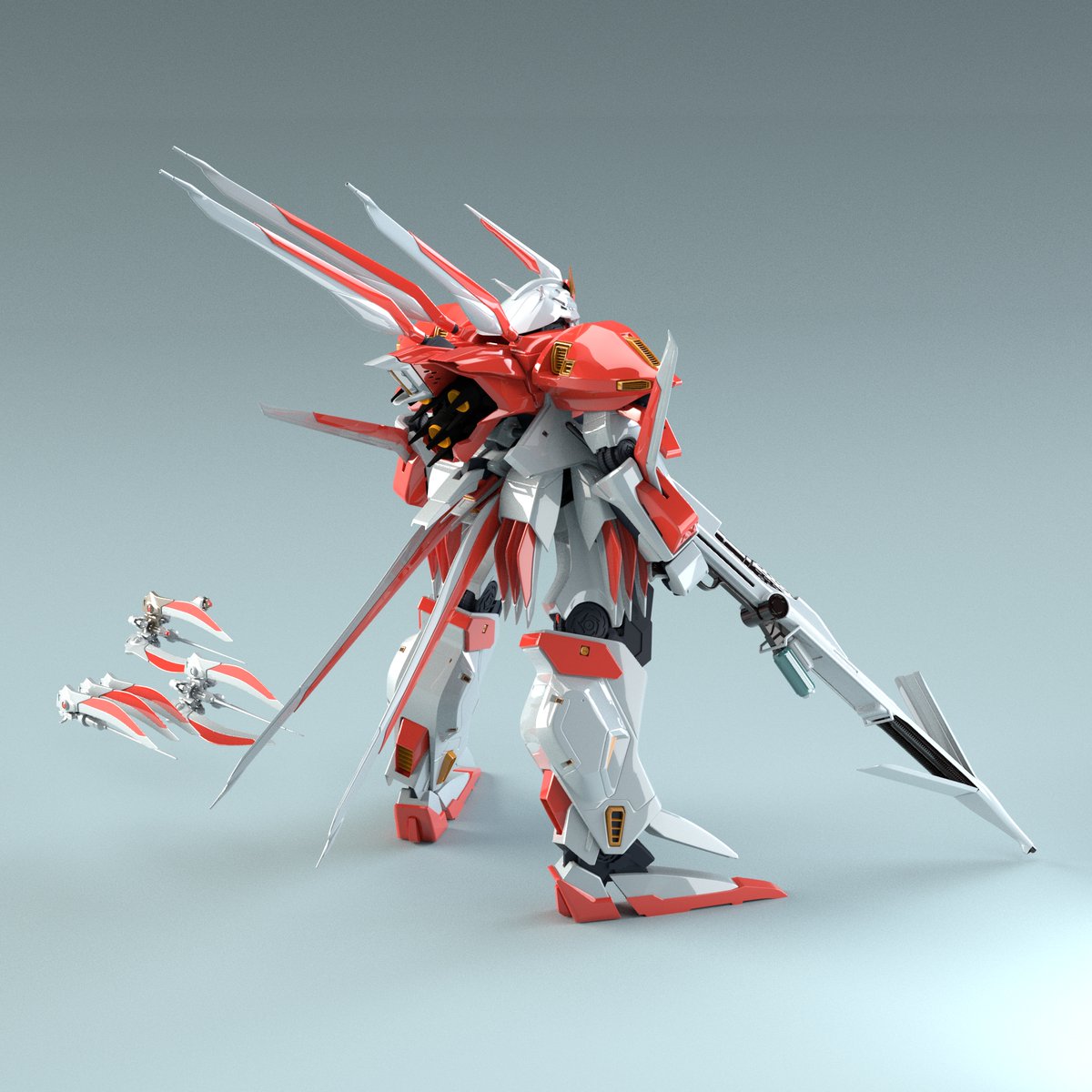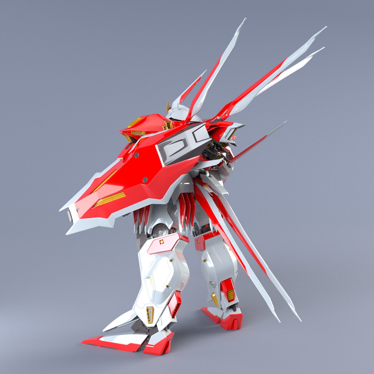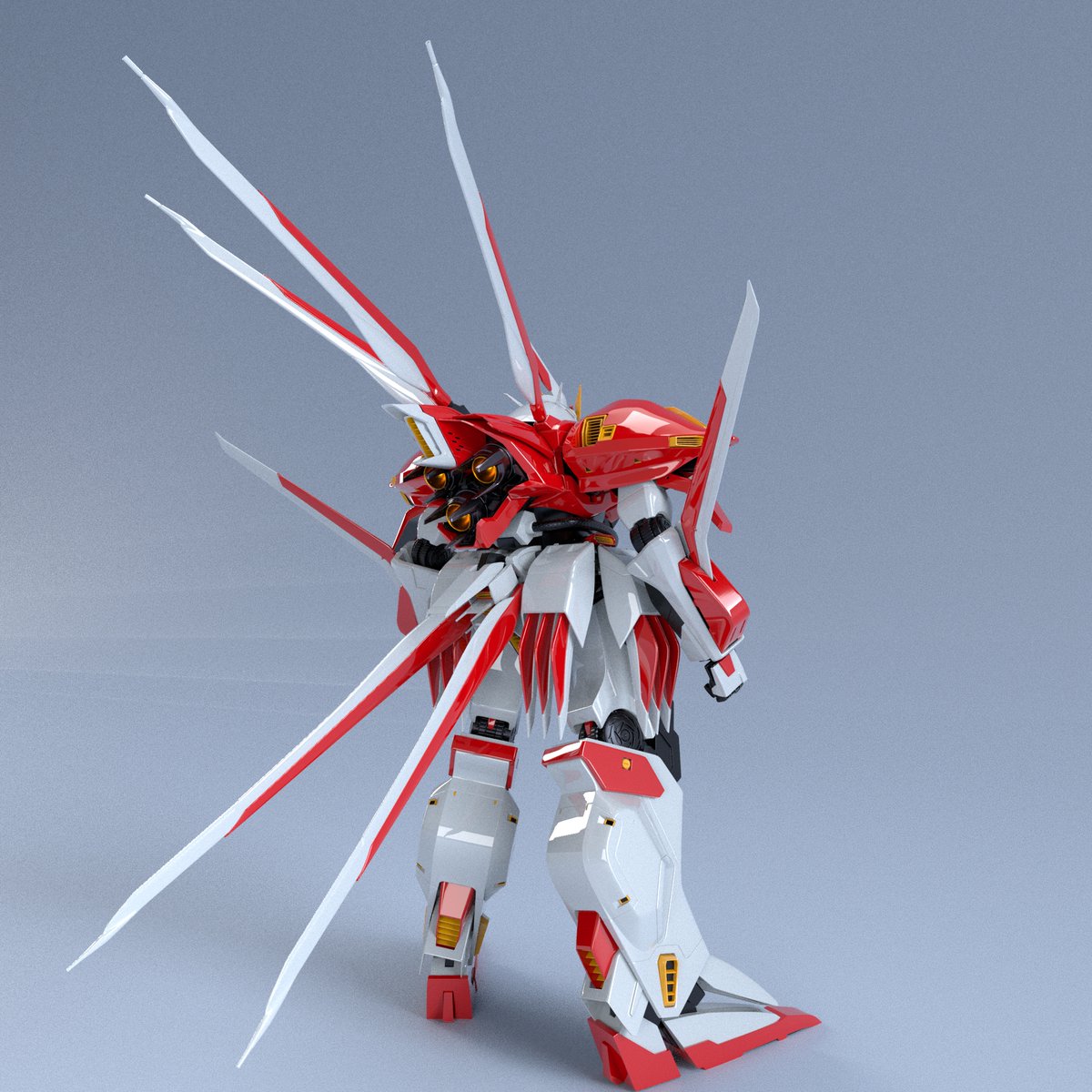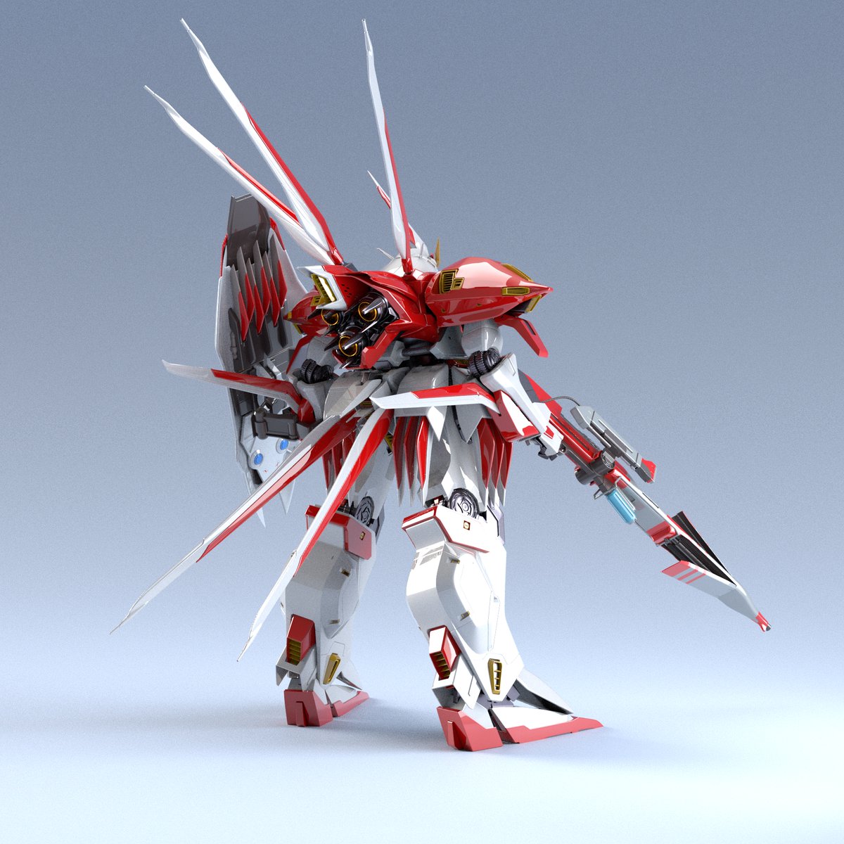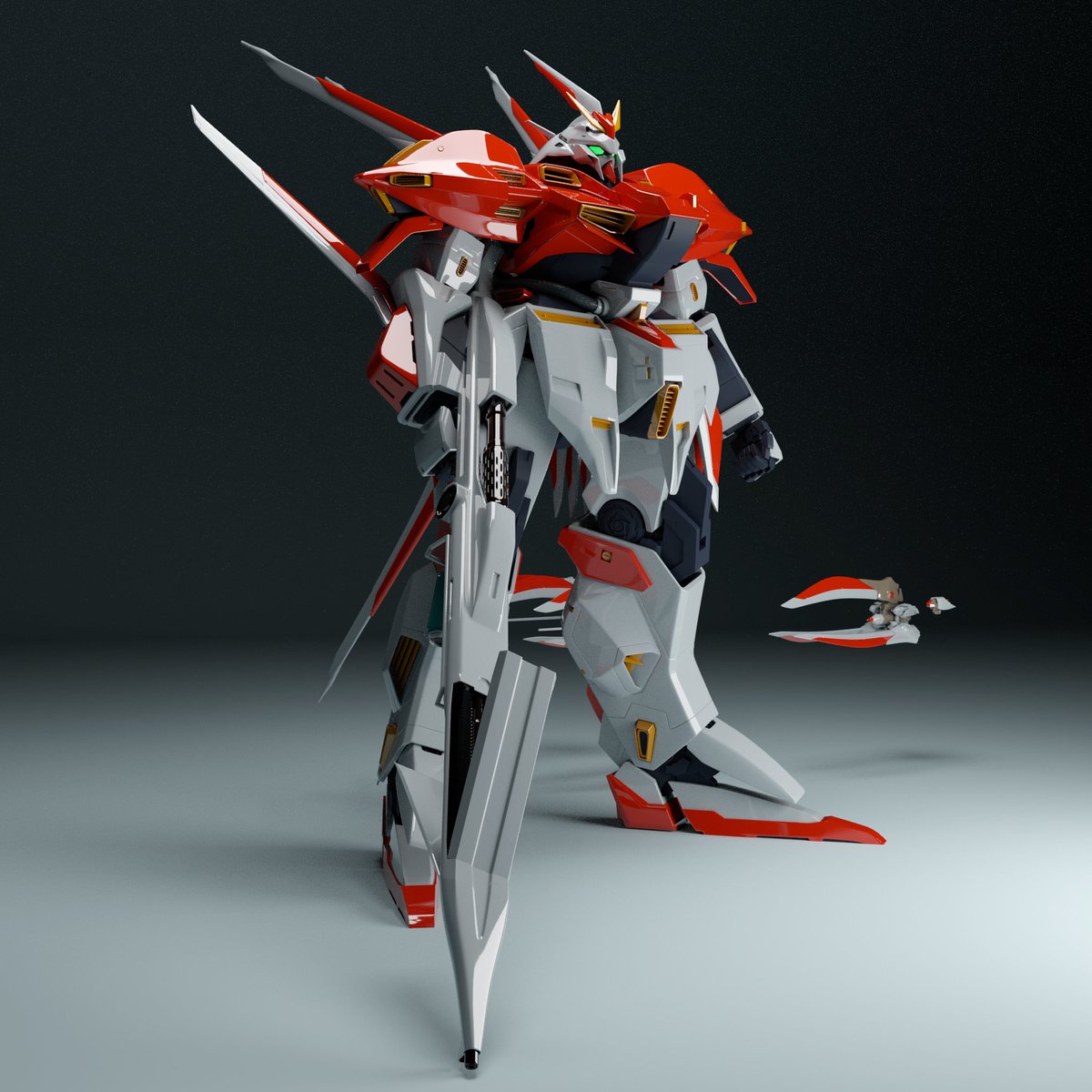 別のPCでレンダリングしたらライトがおかしい。暗い。モデリングは資料が命とはいえガイアギアの資料なんかはもうwebにも解像度的に十分な資料などはほとんど見当たらない。30年前にニュータイプとか全部ジップロックに入れて土に埋めて保存しておくべきだった🥲