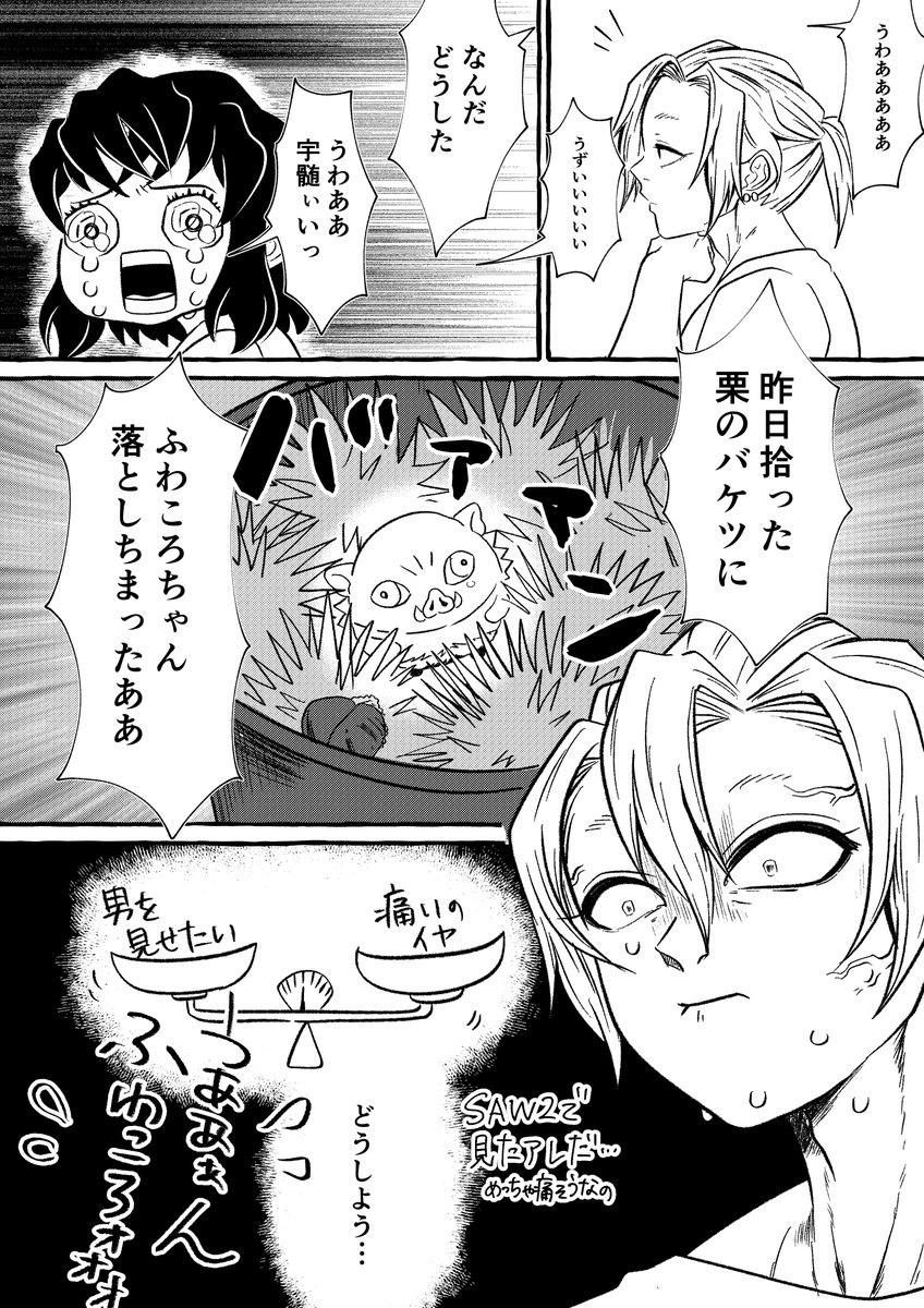 今回も開催ありがとうございます‼️ 現パロ宇伊 お題「栗」「ゲーム」で描かせていただきました 2人ともパニクって判断力が落ちています (「ゲーム」は某ホラー映画のやつです) #宇伊版ワンドロワンライ