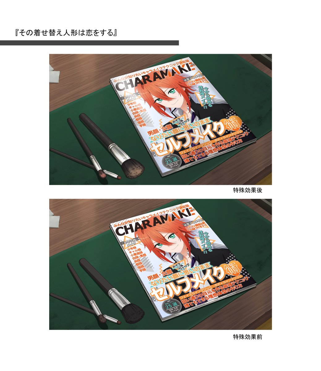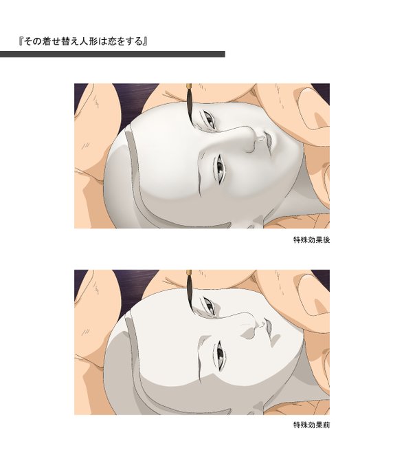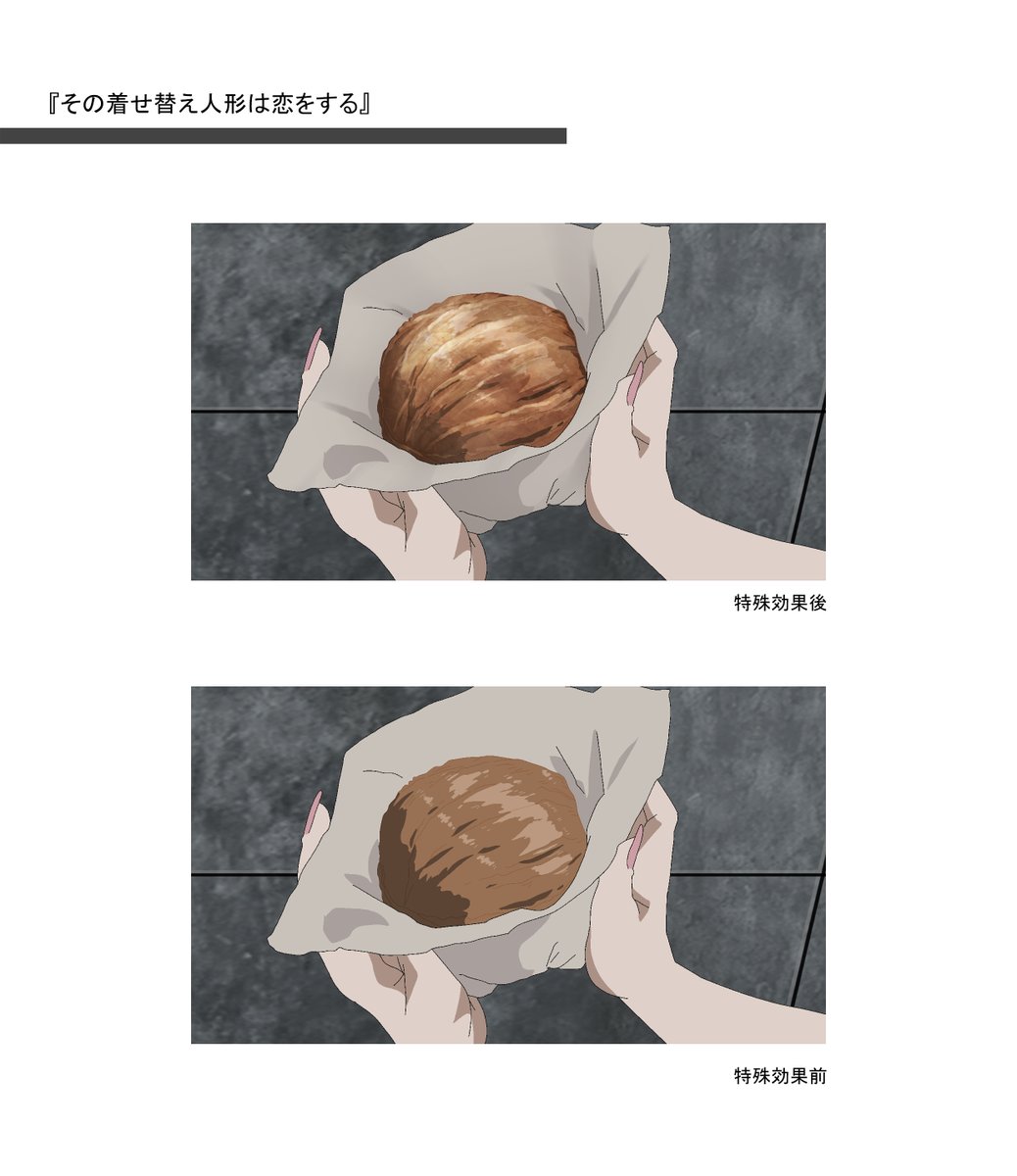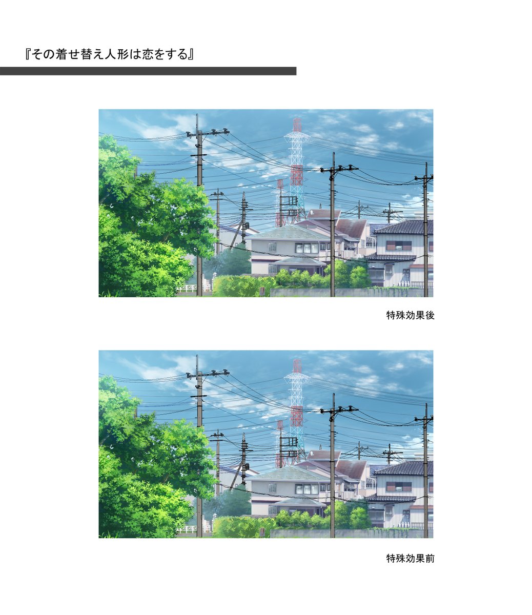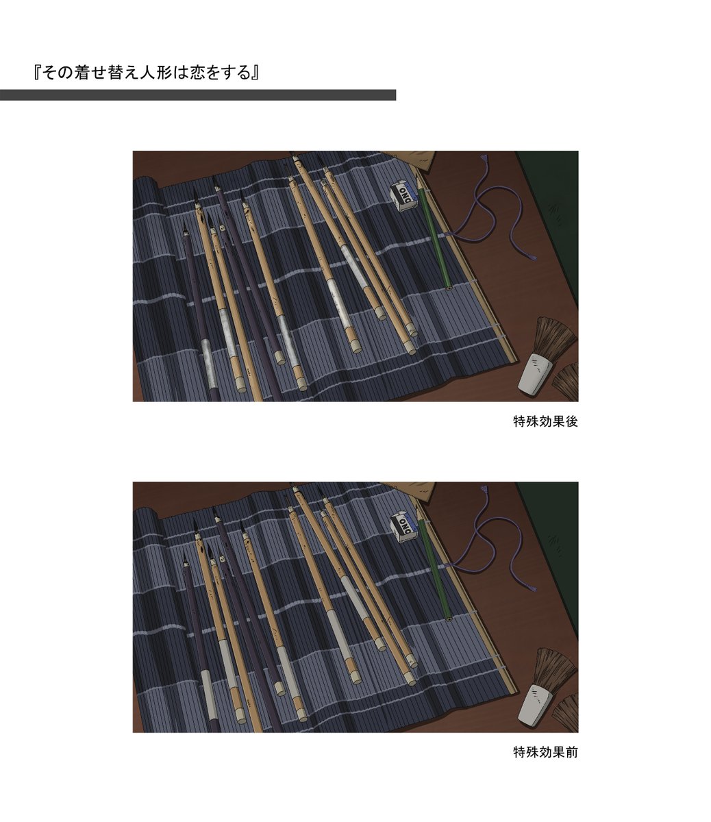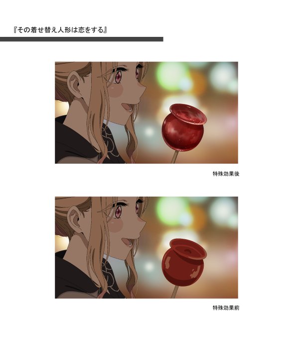 『その着せ替え人形は恋をする』 特殊効果で参加させていただいております。 楽しく作業をさせていただきました。 引き続き #着せ恋 お楽しみいただければ幸いです。 アニメの特殊効果は主に質感を描き足す作業になります。#入佐の特殊効果の処理前処理後