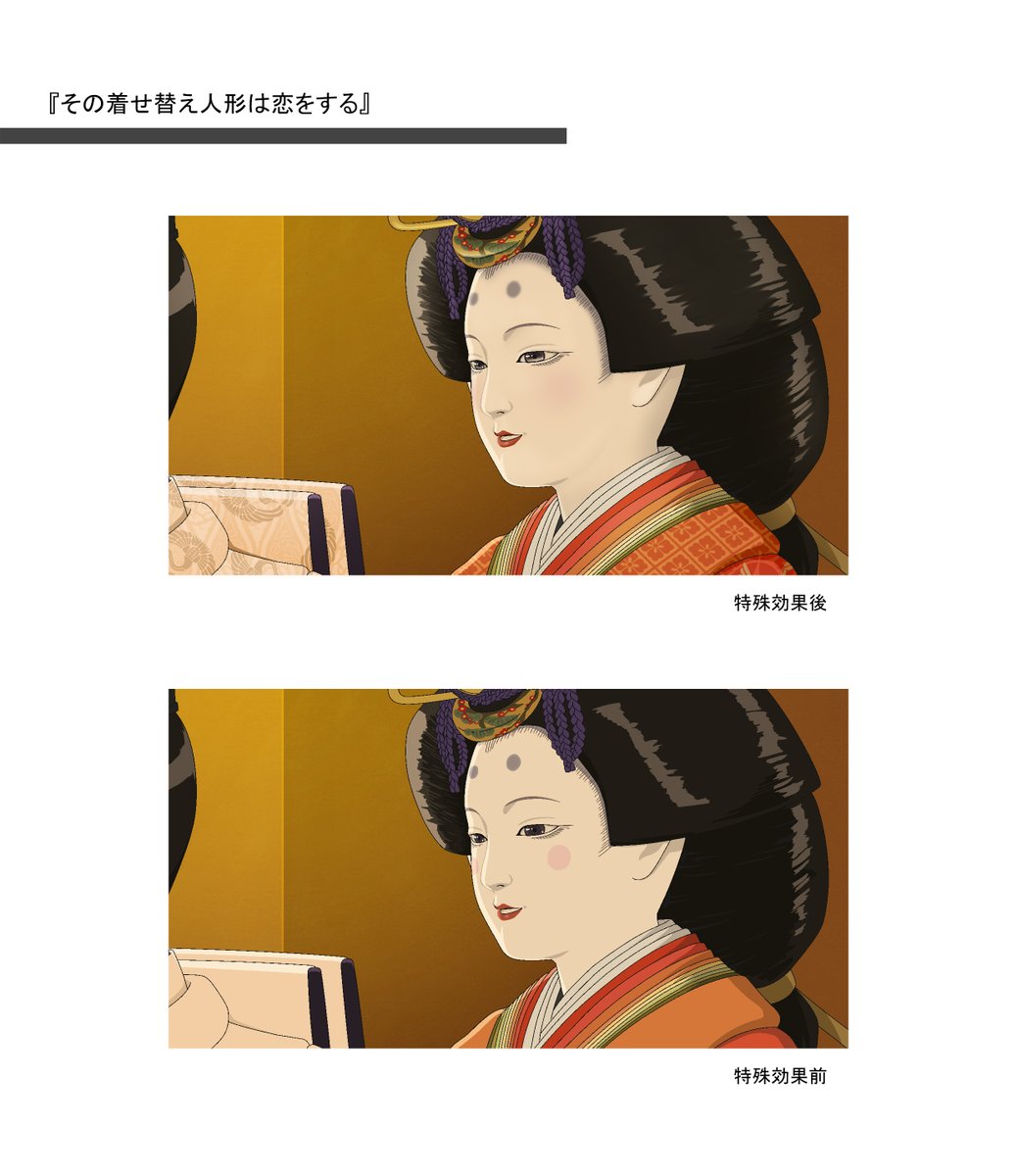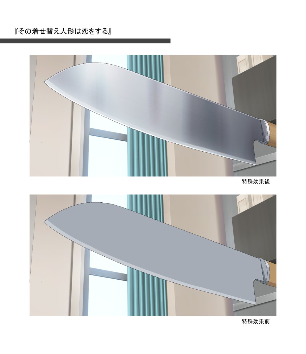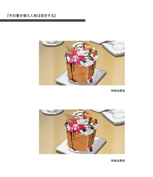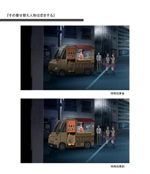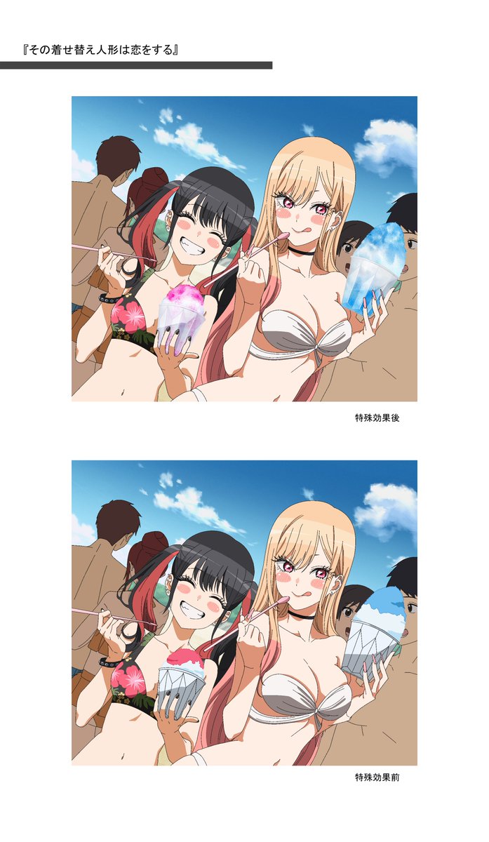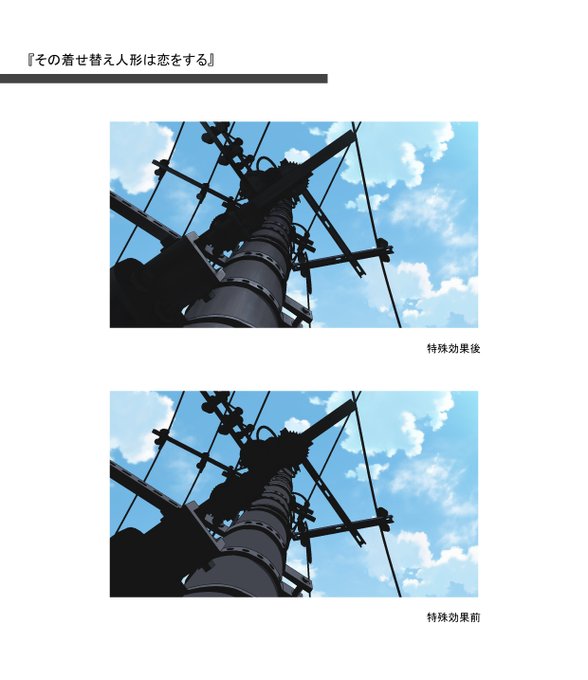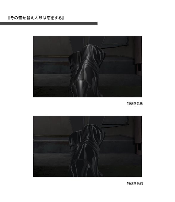『その着せ替え人形は恋をする』 特殊効果で参加させていただいております。 楽しく作業をさせていただきました。 引き続き #着せ恋 お楽しみいただければ幸いです。 アニメの特殊効果は主に質感を描き足す作業になります。#入佐の特殊効果の処理前処理後