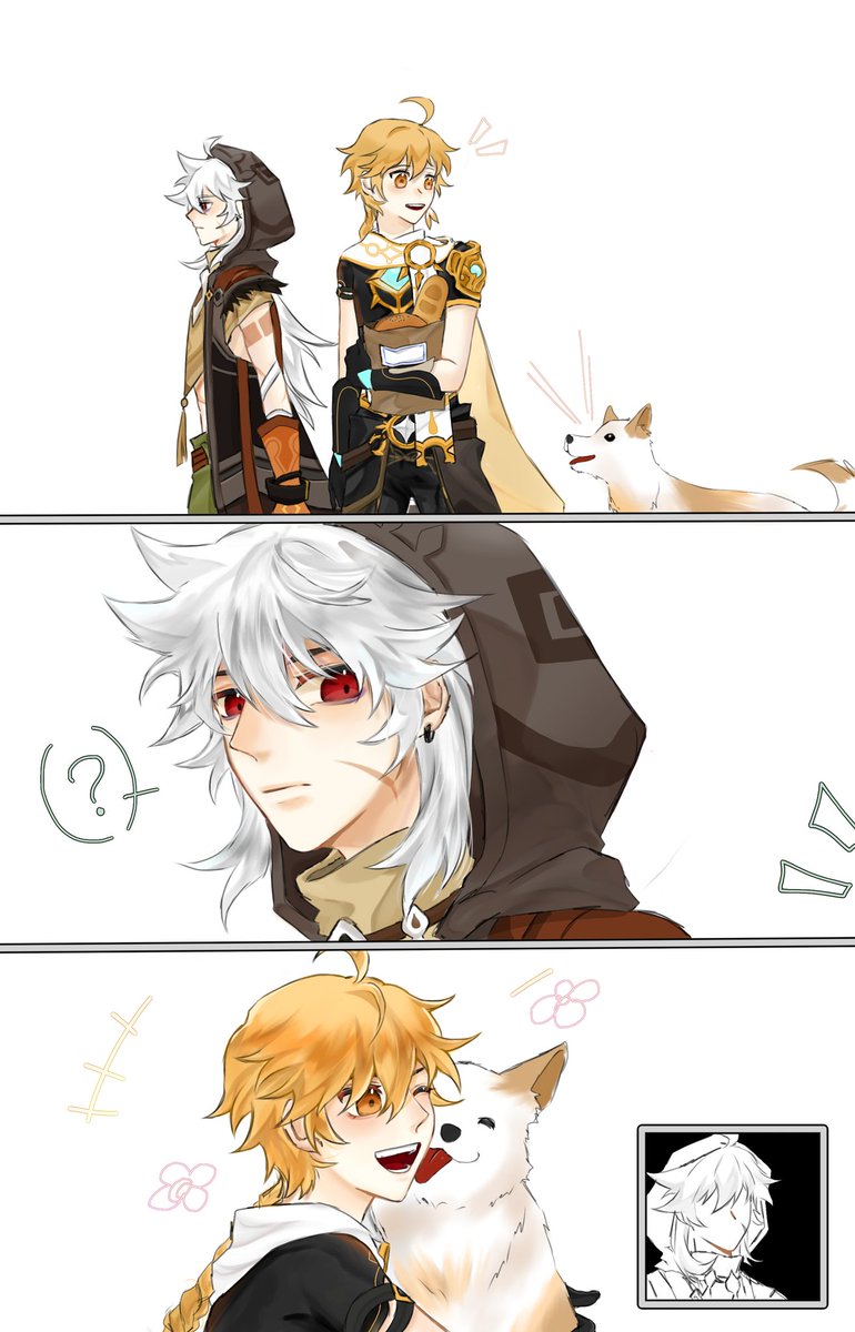 Aether adopted a smol 🐶 And Razor is on his heat ( ͡° ͜ʖ ͡°) I deleted this post accidentally so I repost this. #Genshin_Impact #genshinimpactfanart #Aether #Razor