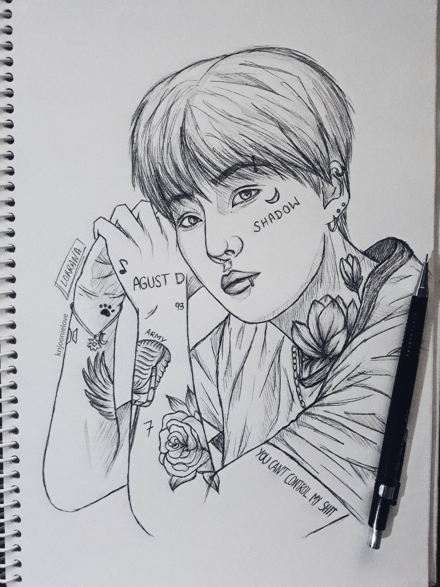 e vamos com um desenho do Yoongi todo tatuado pra comemorar o aniversário dele ✊🏻🎹🎤 (aliás eu tô surtando pq nunca tinha feito um desenho nesse estilo e amei pra caramba aaa kkk) @BTS_twt #btsfanart #HappyBirthdayYoongi #HappySUGAday