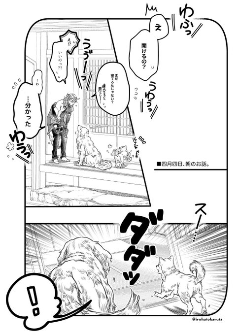お帰りなさい三日月さん🌸。 防人作戦、四月四日朝① モフモフ…と。お散歩本丸です。 これからも宜しくお願い致します🐾。