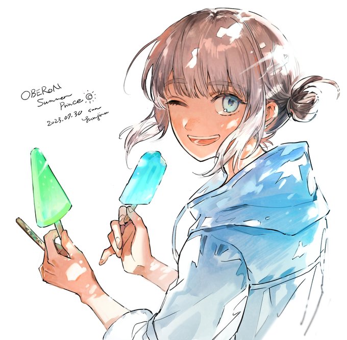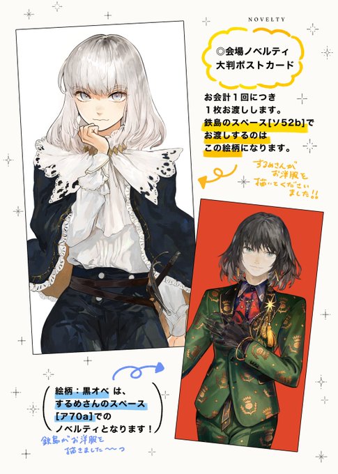 🌟ノベルティのお知らせ 会場でのお会計1回につき、するめさん(@ame_ame05)との合作イラスト(!)大判ポスカをお付けします。お互いが描いたオベロンを交換して、それぞれに好きな洋服を描き込んだという代物。鉄島スペースでは白オベのポスカが貰えます。黒オベはするめさんスペース【ア70a】で! twitter.com/ironjima/statu…