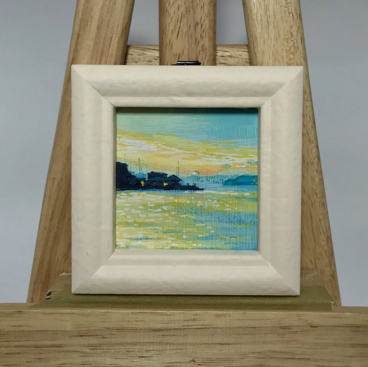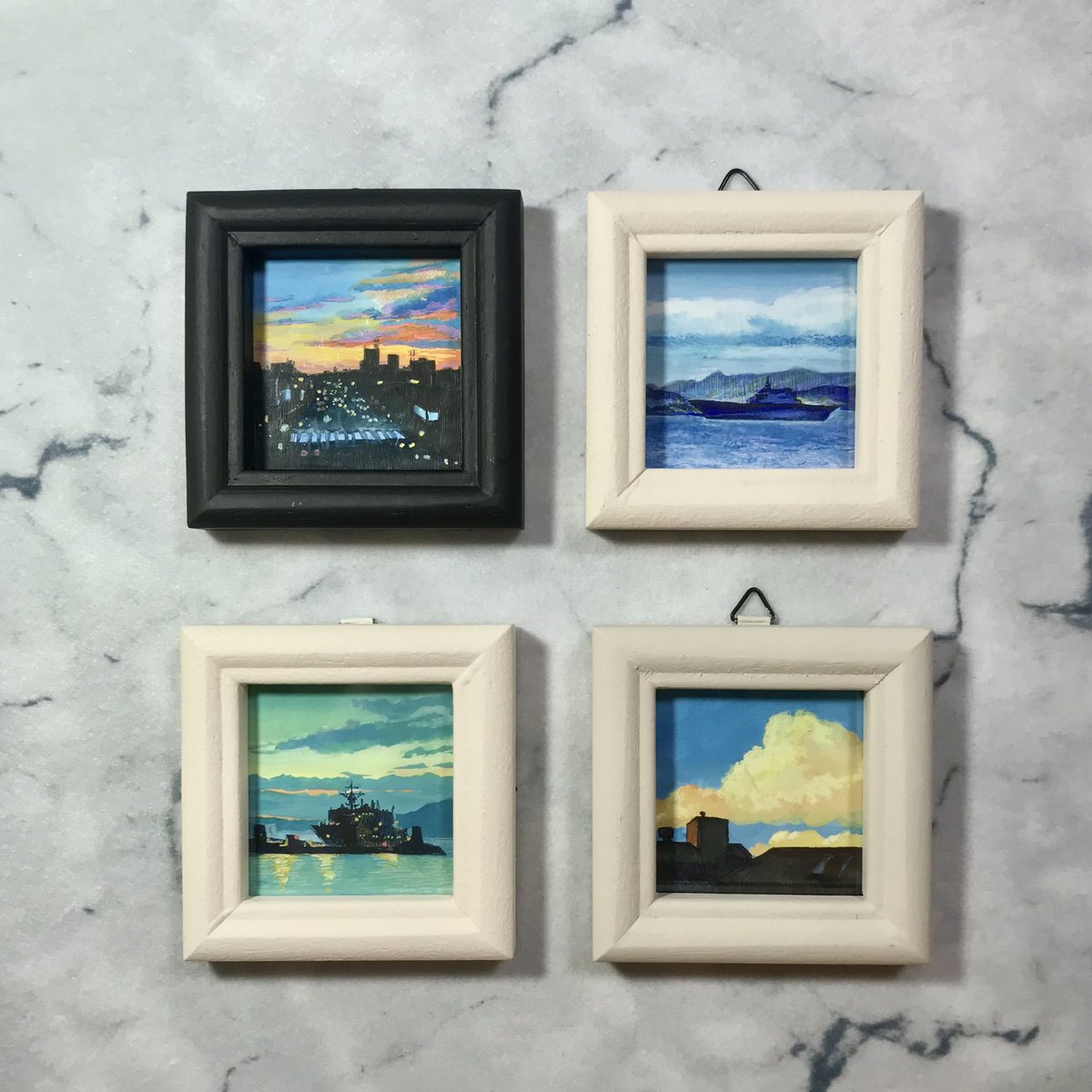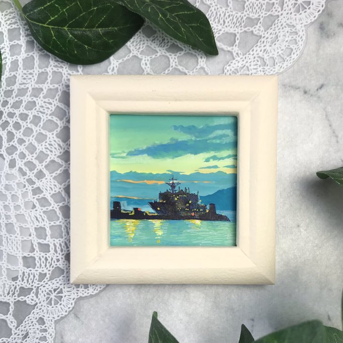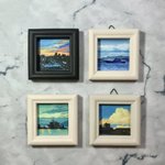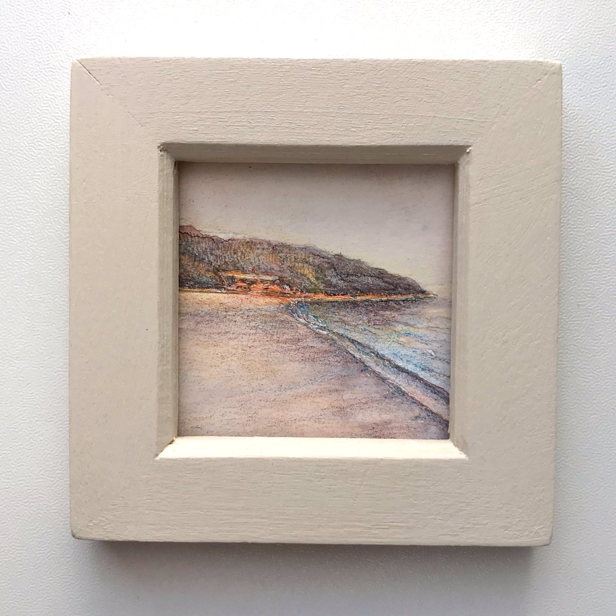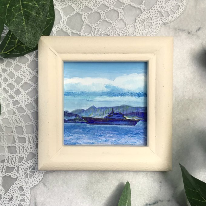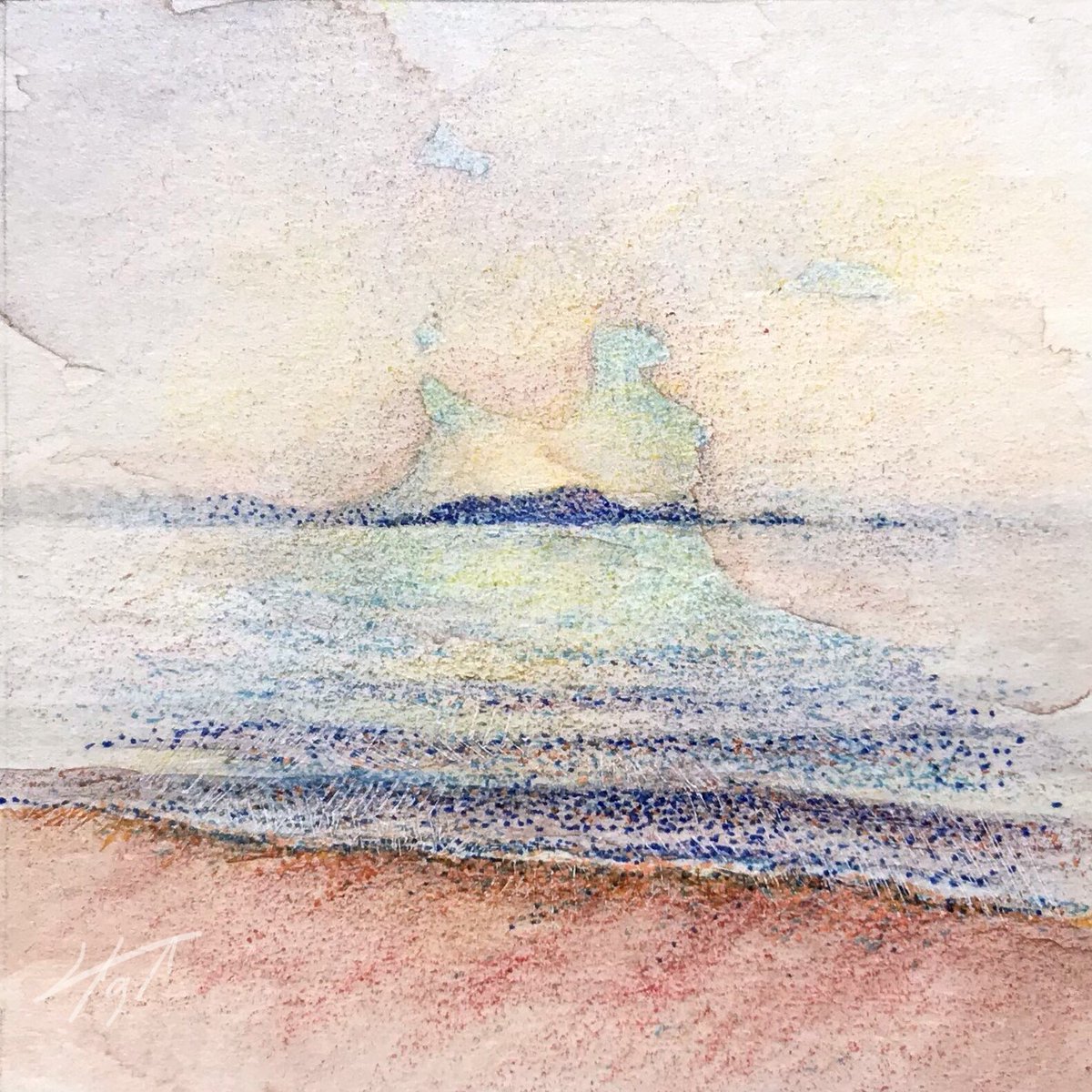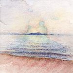 【作品紹介】 小さな絵画シリーズ 「海岸のまぼろし」 原画サイズ:55×55㎜ 使用画材:水彩、色鉛筆、ボールペン 夢うつつな記憶の中の、遠くてよく見えない海岸の向こうにある何か まぶたの裏側に浮かぶ記憶の中の風景を描きました #人間の間の絵置き場