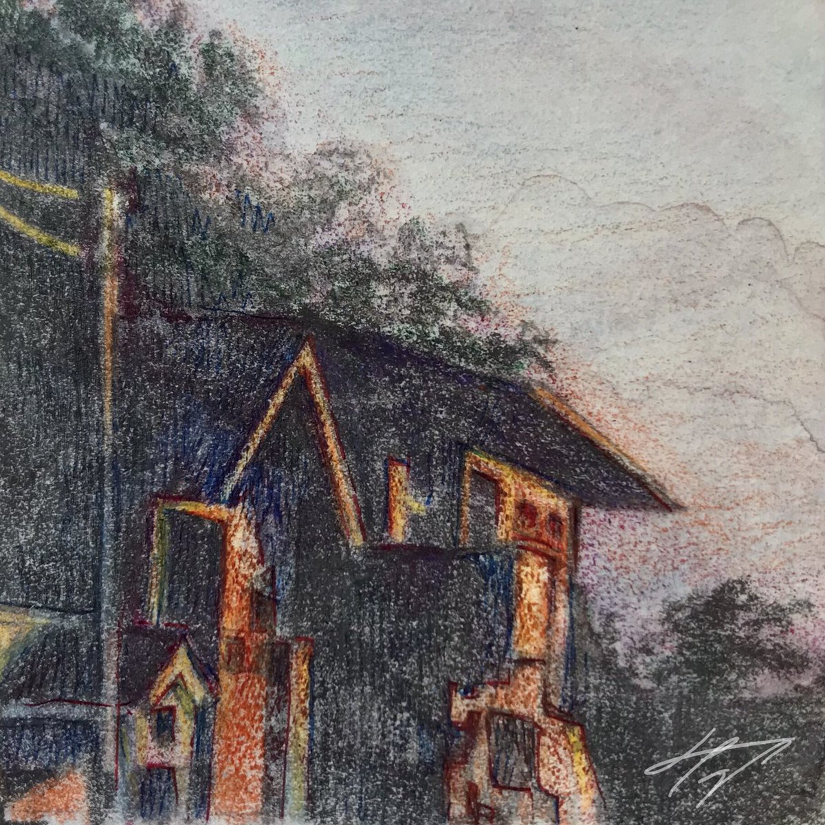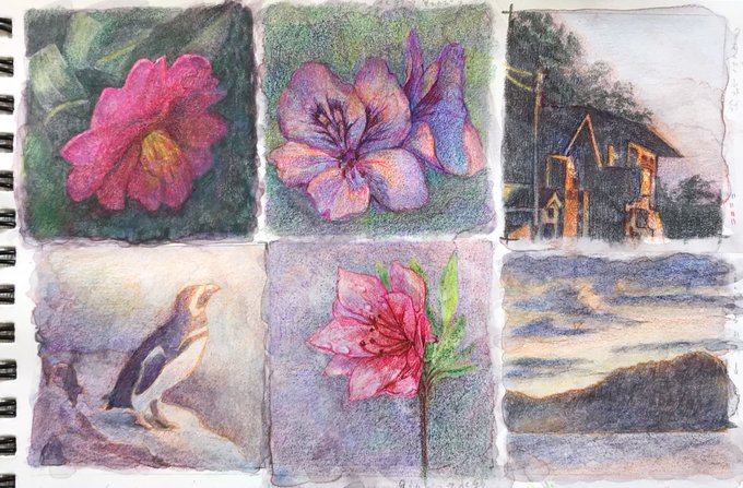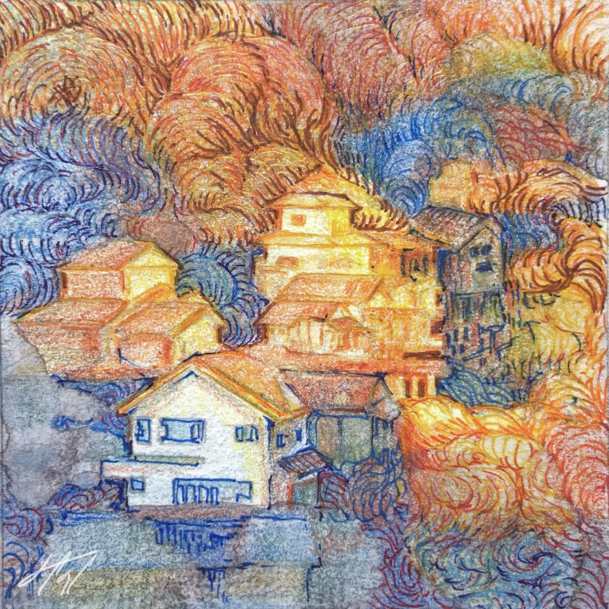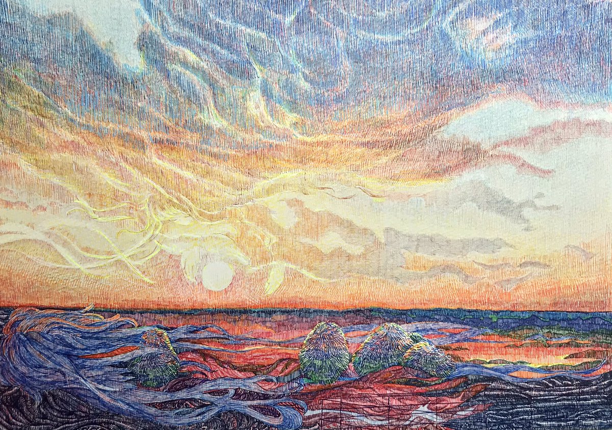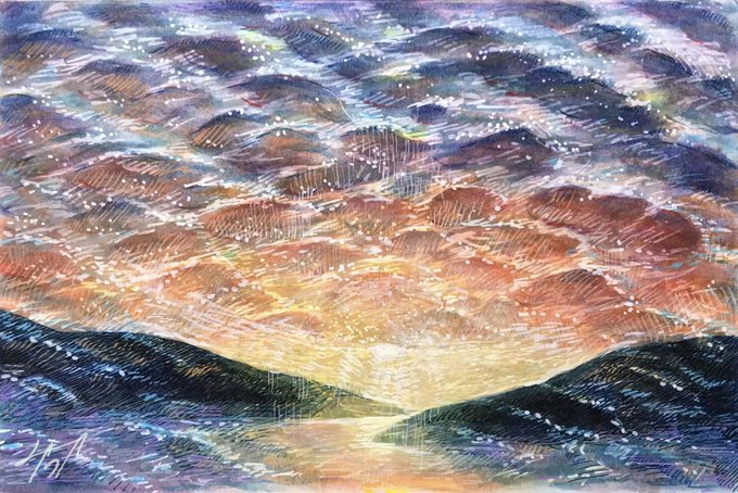 【作品紹介】 小さな絵画シリーズ 「あの日の帰り道」 原画サイズ:55×55㎜ 使用画材:水彩、色鉛筆、ボールペン 仕事や学校などの帰り道に見た光景はなぜか記憶に残りやすい気がします 身体に夕陽が沁みていくような感覚を覚えることがありそれをイメージしながら描きました #人間の間の絵置き場