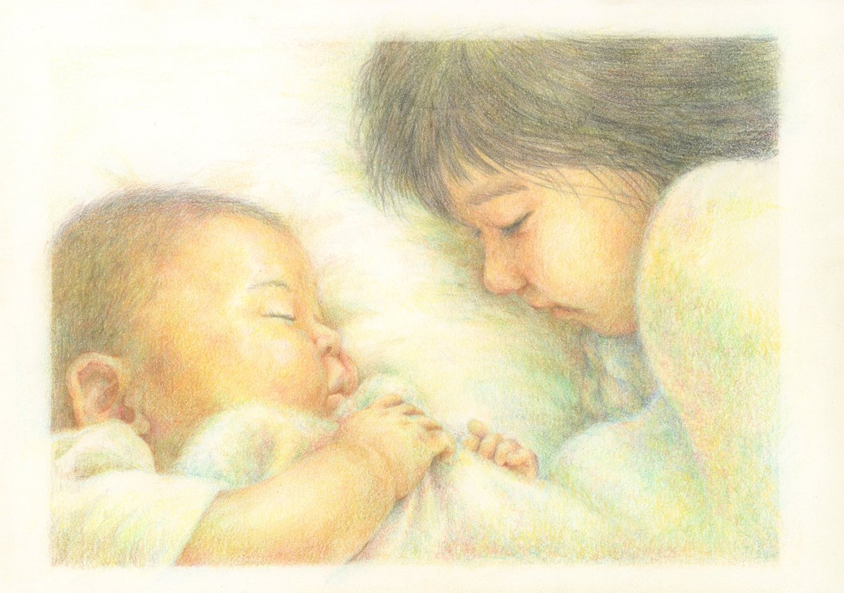 「寝息」 子供の寝顔と穏やかな寝息って本当に気持ちよさそうっていうか、嫌なことも忘れちゃうっていうか、癒されます。 #色鉛筆画 #子育て #イラスト好きな人と繋がりたい #育児 #絵描きさんと繫がりたい