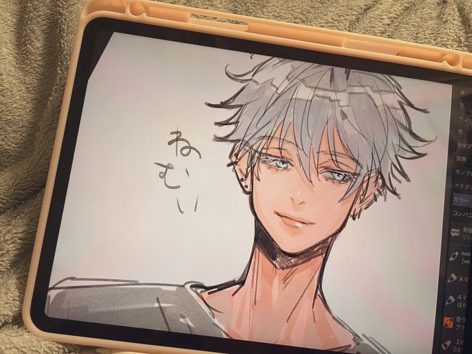 寝起きにチラッと落書きするのには良いよねiPad…… 最近ごじょうさんの顔面迷走してたので、こんなのが好きだな〜というのだけ意識したやつ。輪郭が大人の男の人って感じなのが好きなので、私個人的には大人っぽい美人のイメージでいつも描いてる。描けてるかはふわふわ