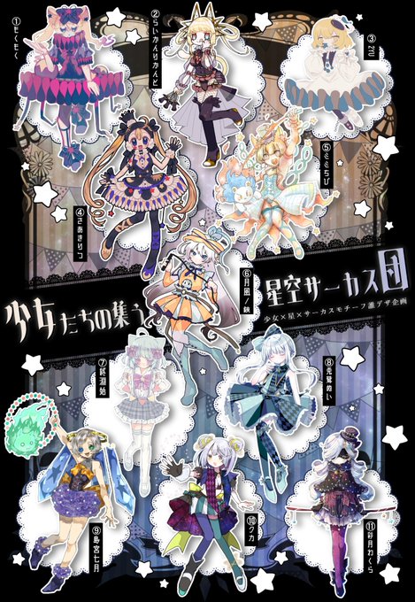 兎鷺ぬいさん主催の #誰のキャラデザだゲーム に参加させていただきました! テーマは「少女×星×サーカス」です!! しまみやは⑨番の子を描かせていただきました~!しまみやのキャラデザした子はどの子でしょう!当ててみてくださいね✨ アンケはリプに繋げます↓↓ #少女たちの集う星空サーカス団