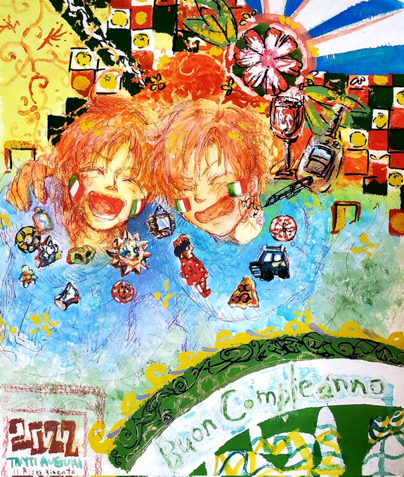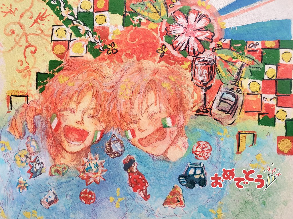 陽気に たくましく 幸せに☕🍕🍅🍷🍊🌼 #マカロニ生誕祭2022 #くるん兄弟生誕祭2022 #伊兄弟生誕祭2022 #水彩