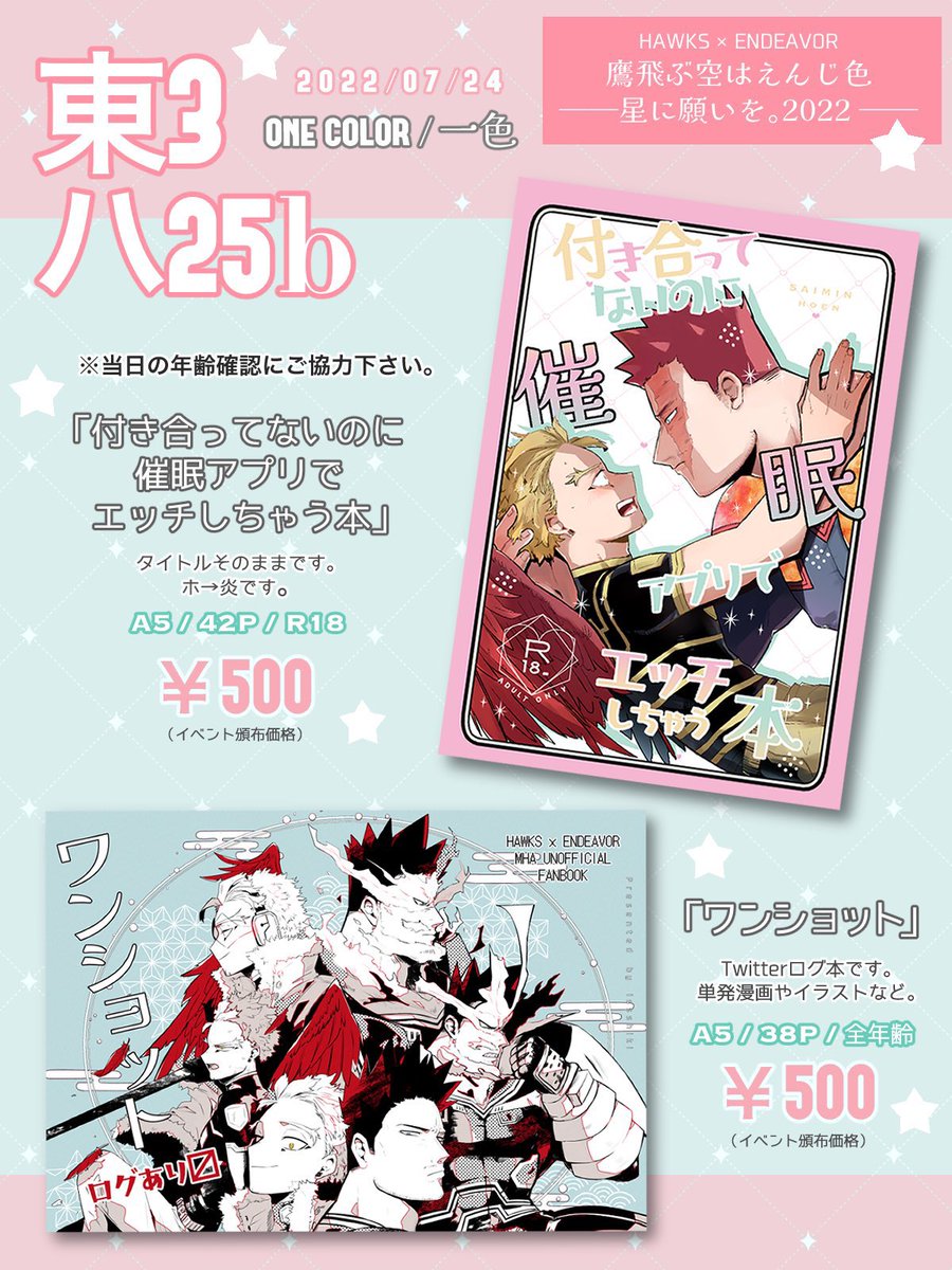 58 179 7/24の鷹飛ぶ空はえんじ色のお品書きです!新刊2冊です。 通販分も会場に持って行くので大丈夫だとは思いますが、もし相互さんで取り置きのご希望がありましたら、DMでご連絡ください🙇♂️ 22/07/10 12:40